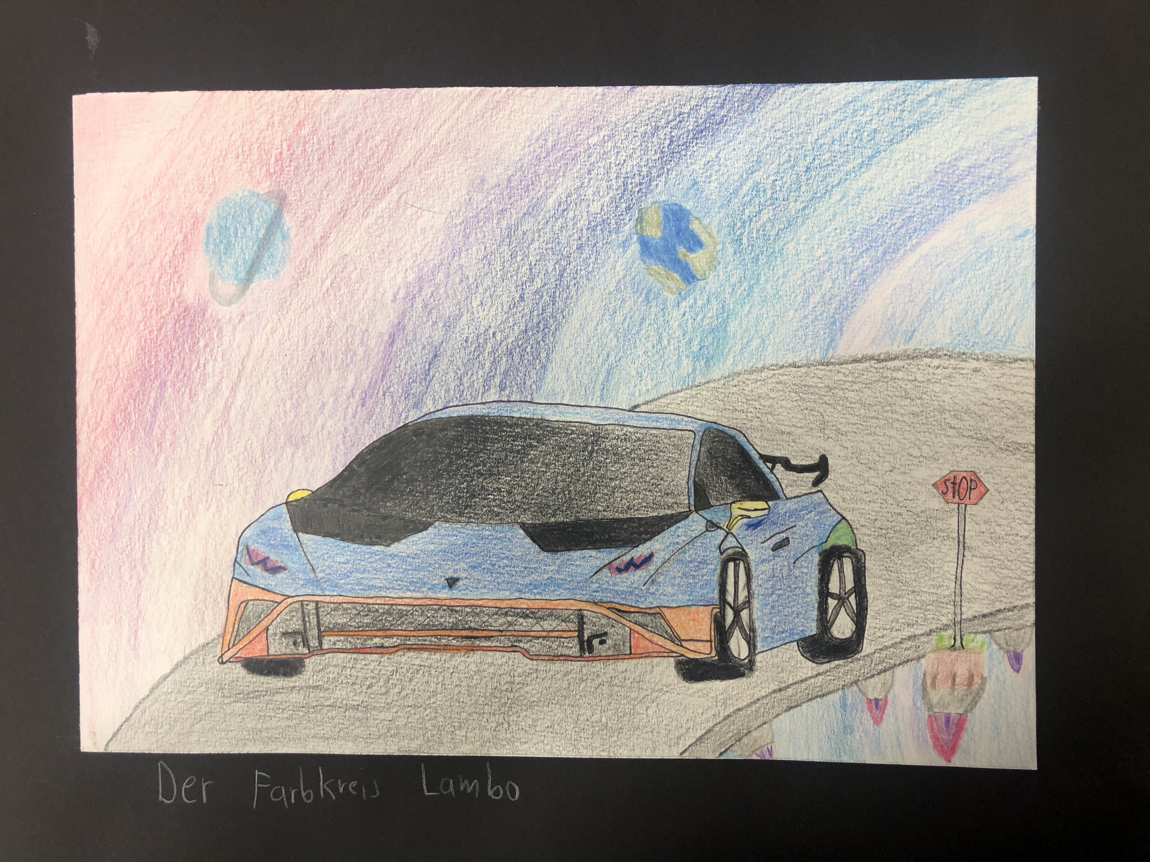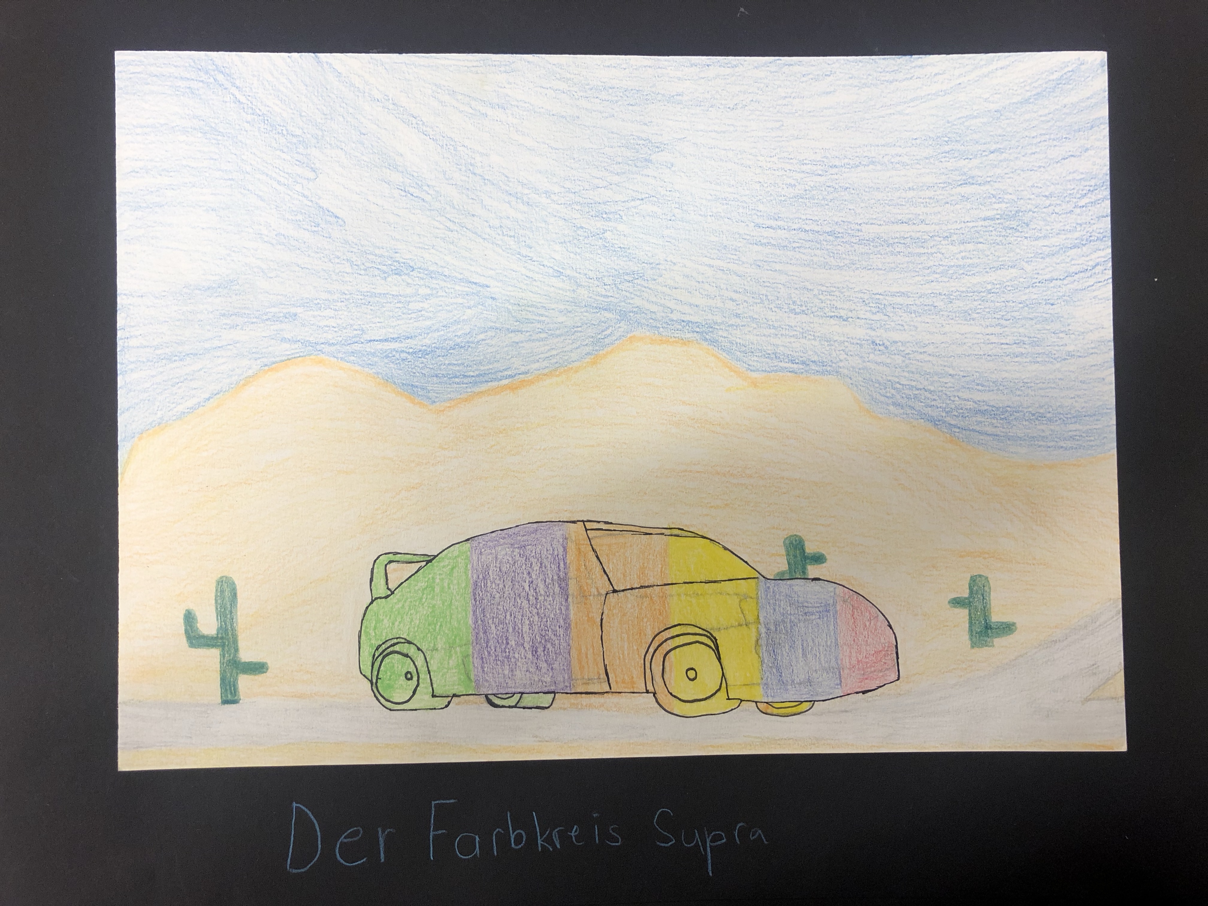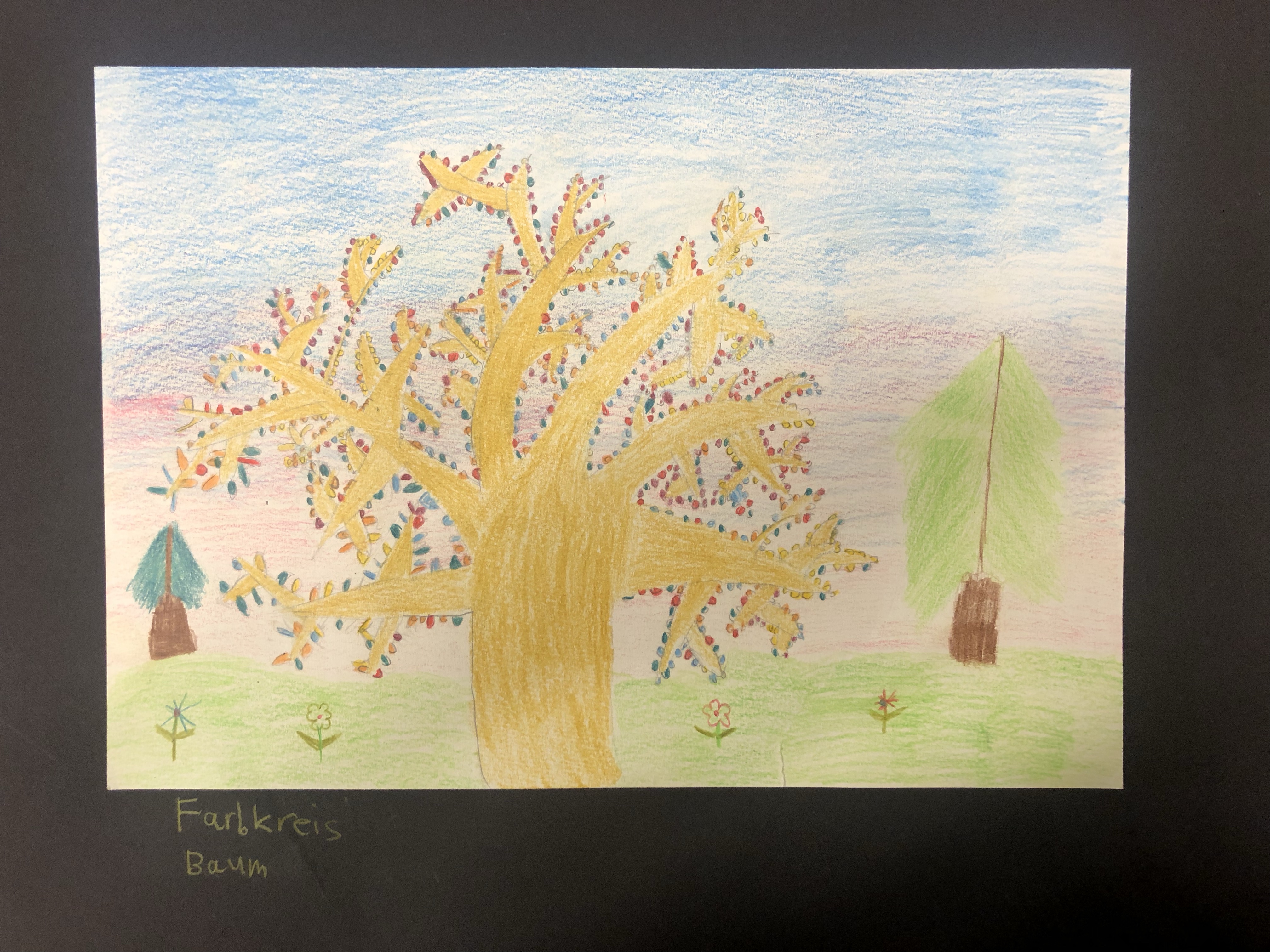 Der Farbkreis wurde behandelt, worauf die Schüler:innen ein Bild nach Wahl mit Farbstiften gestalten. Die Farben des Farbkreises müssen irgendwo im Bild wiederzufinden sein.