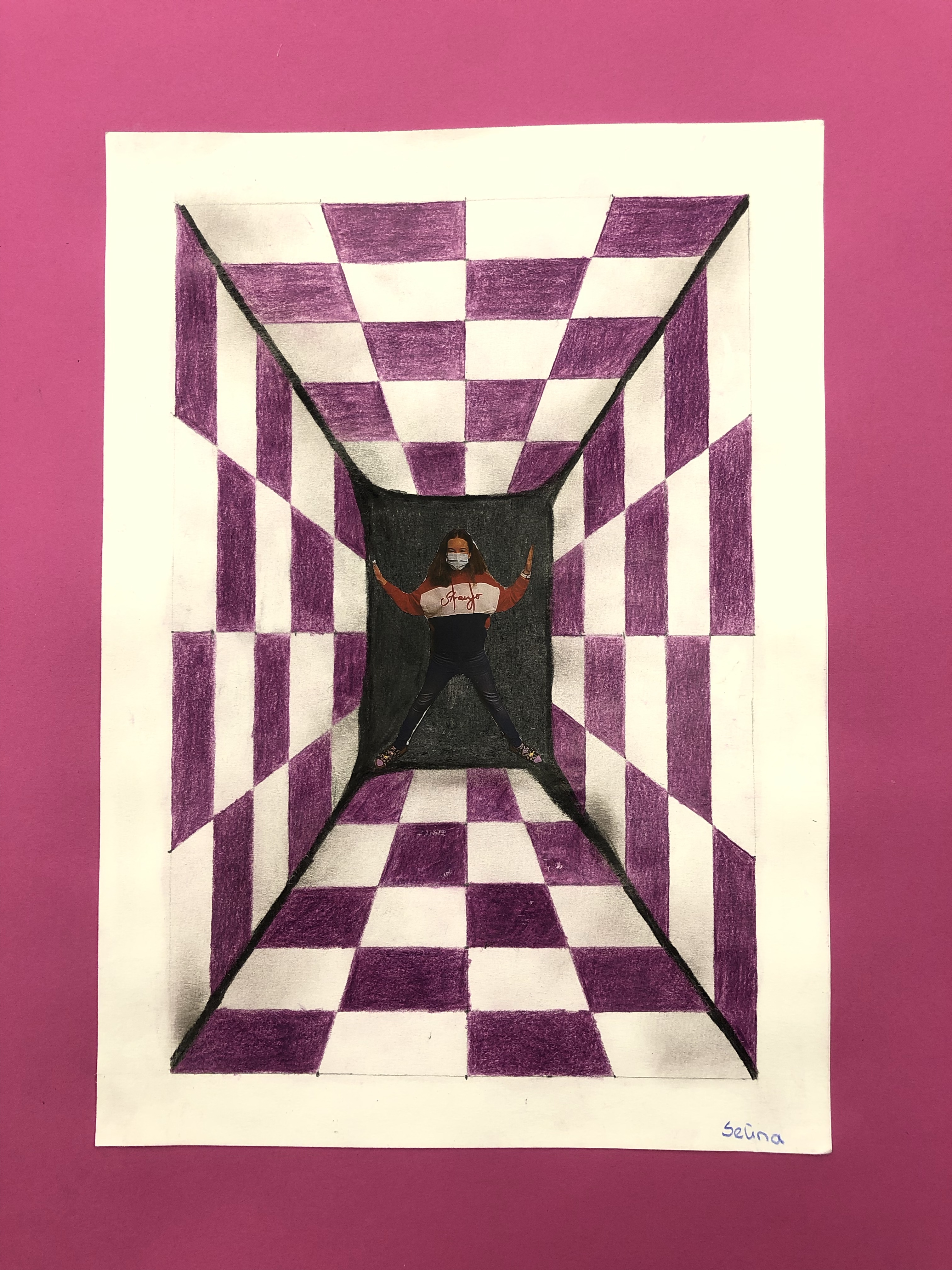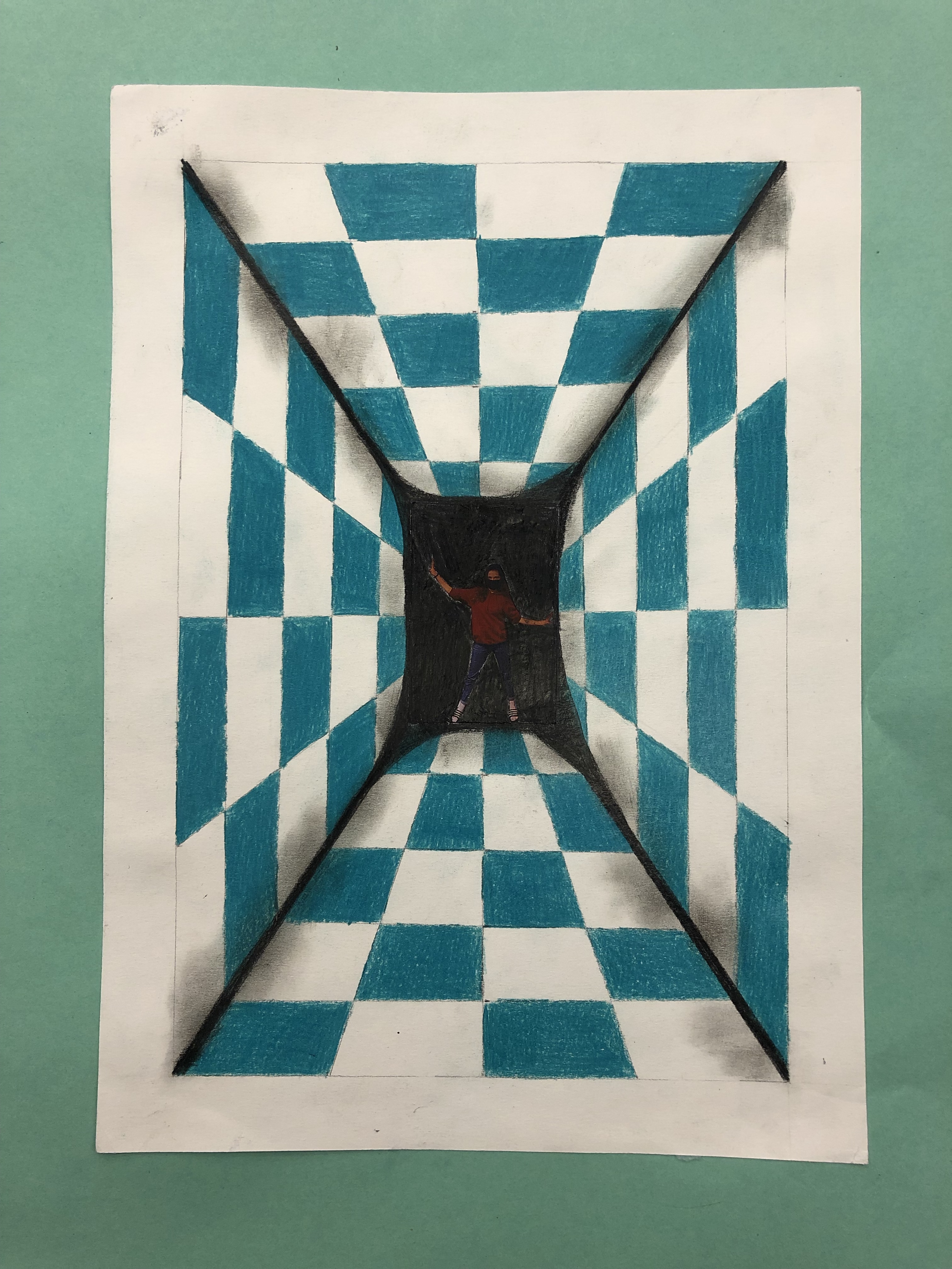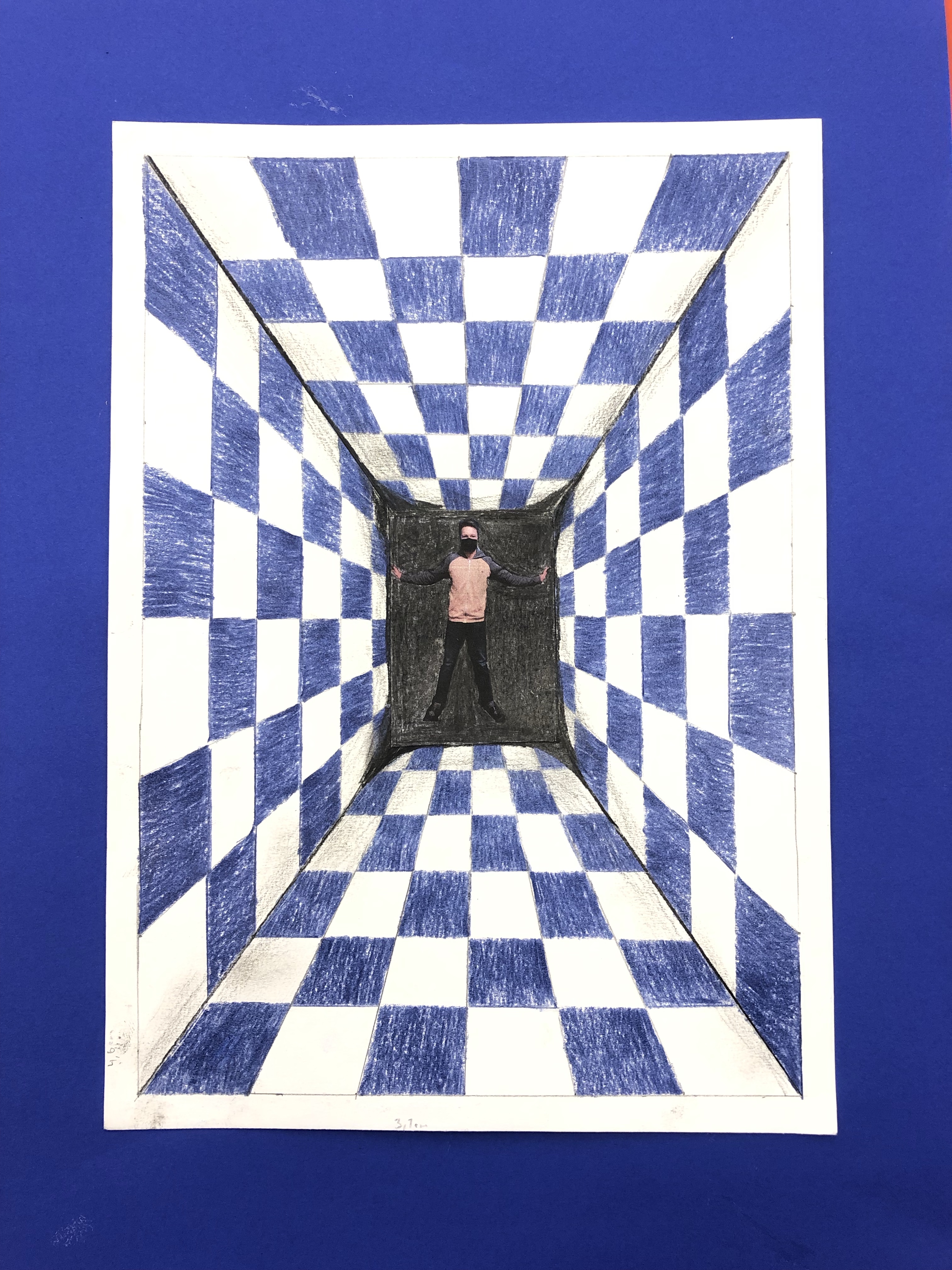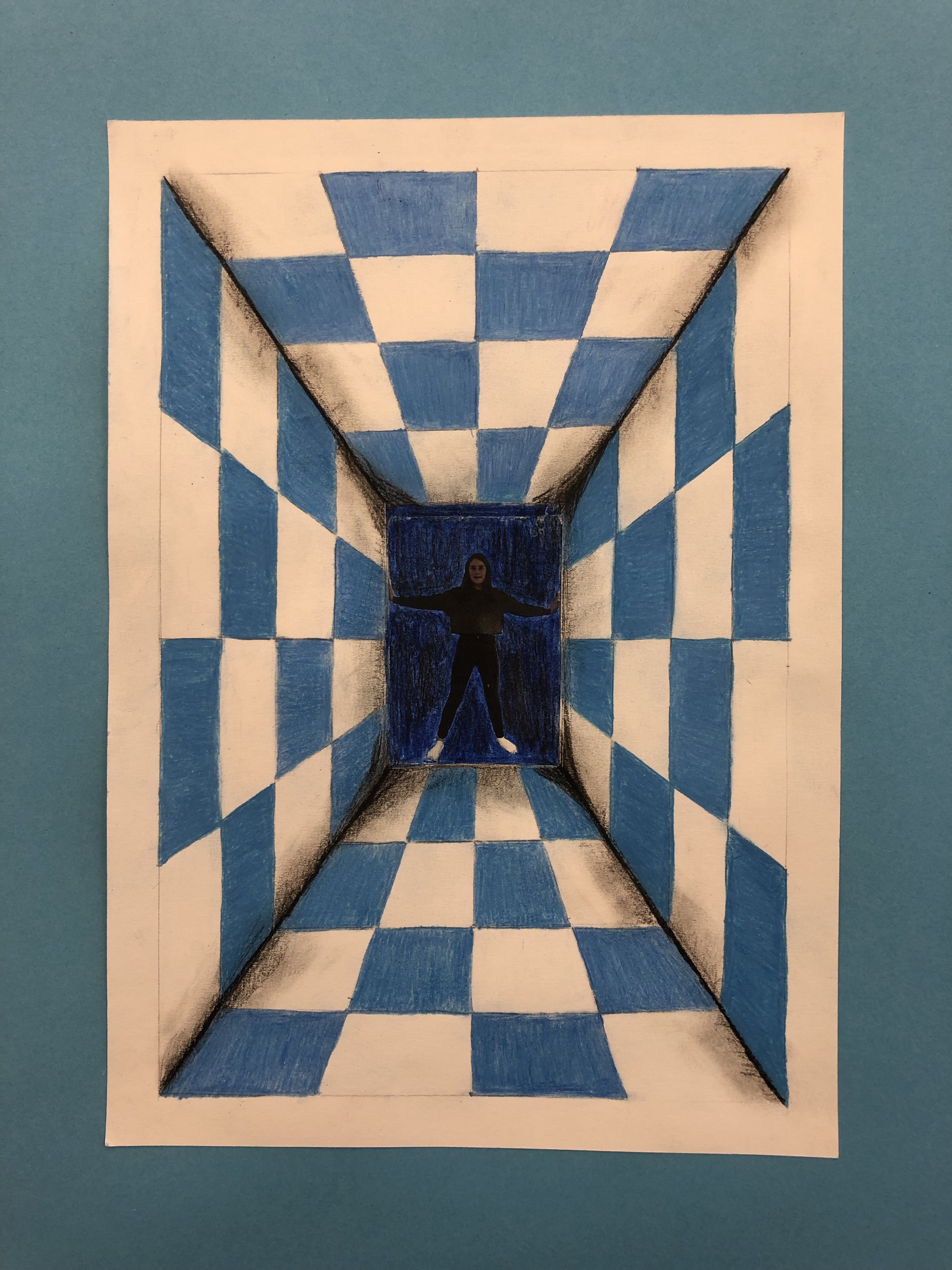 Dieses Foto setzen wir in die Mitte des Raumes, welchen die Schüler mit Karomuster ausmalen. Schattierung hinzufügen und fertig ist das Kunstwerk.