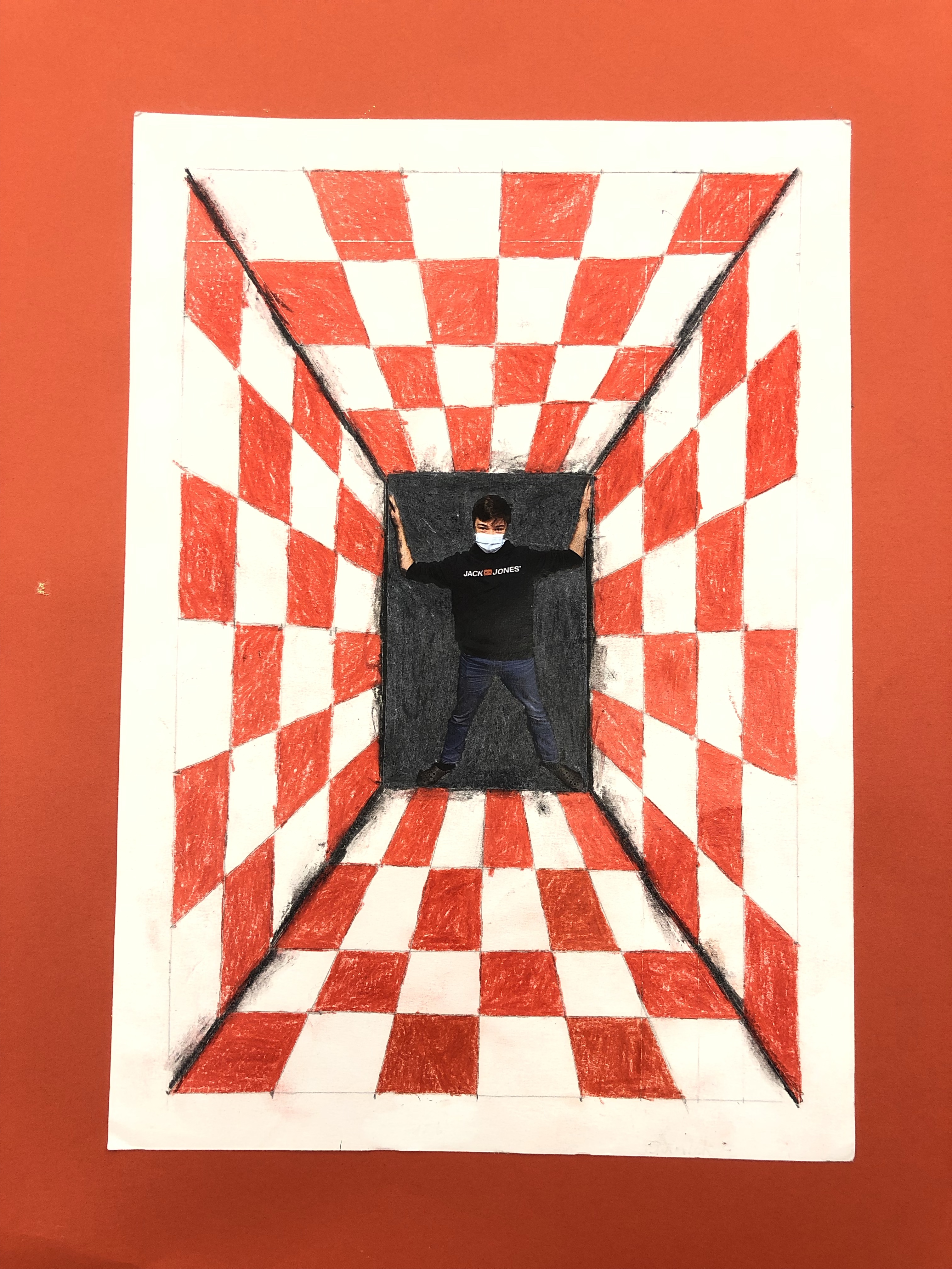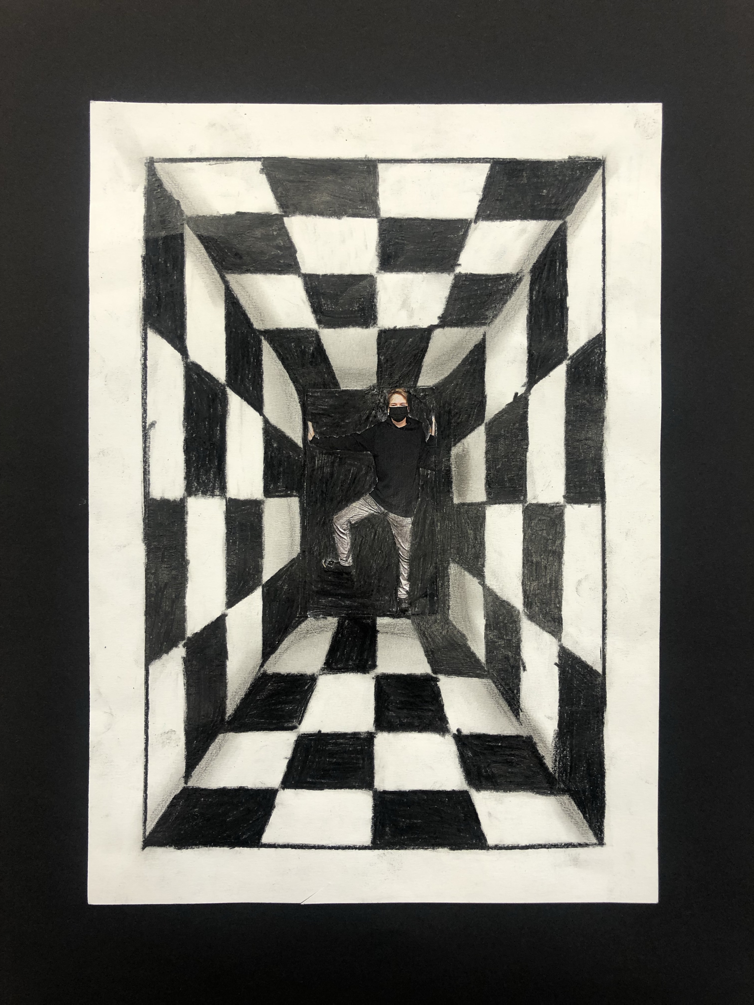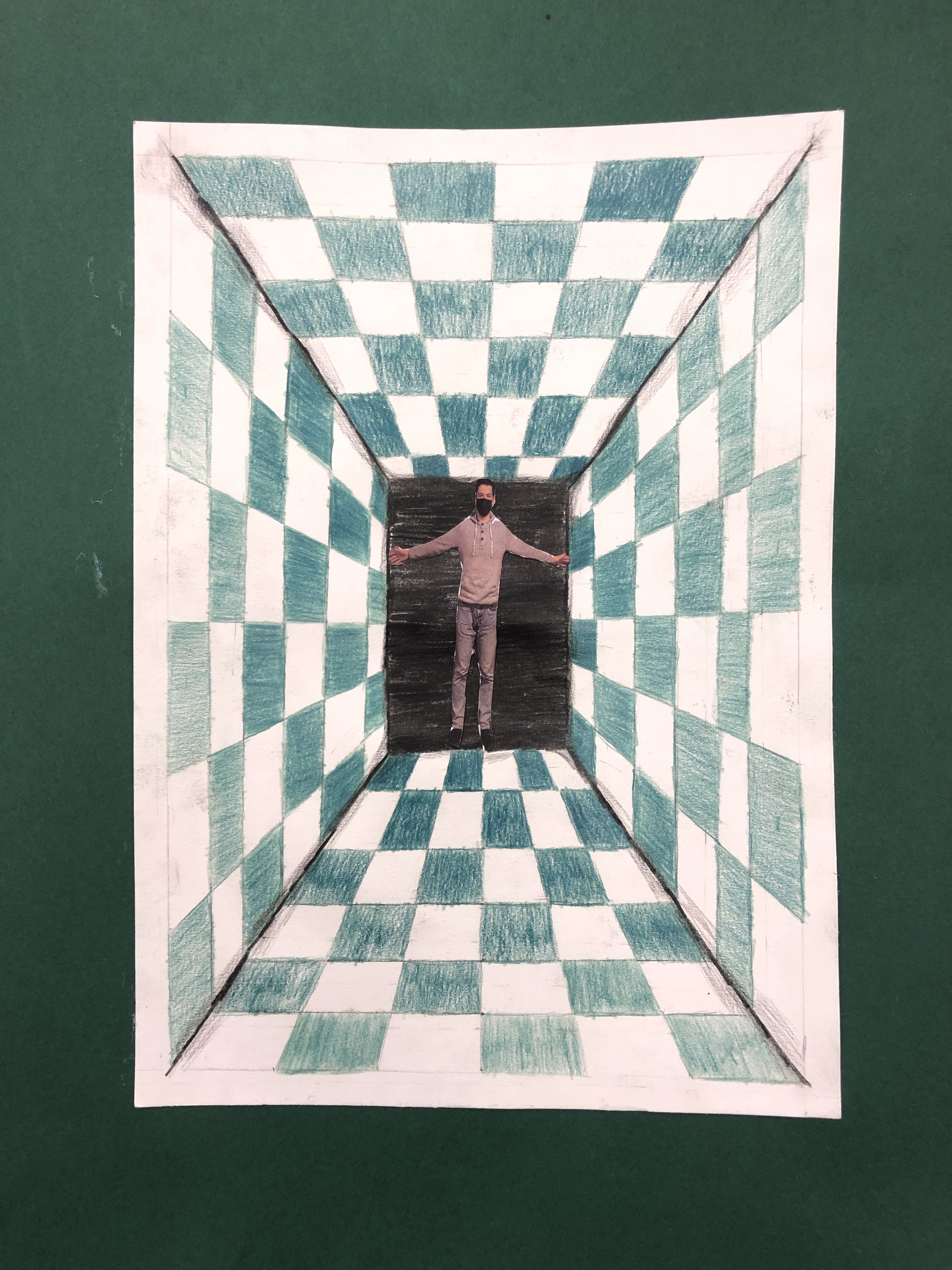 Dieses Foto setzen wir in die Mitte des Raumes, welchen die Schüler mit Karomuster ausmalen. Schattierung hinzufügen und fertig ist das Kunstwerk.
