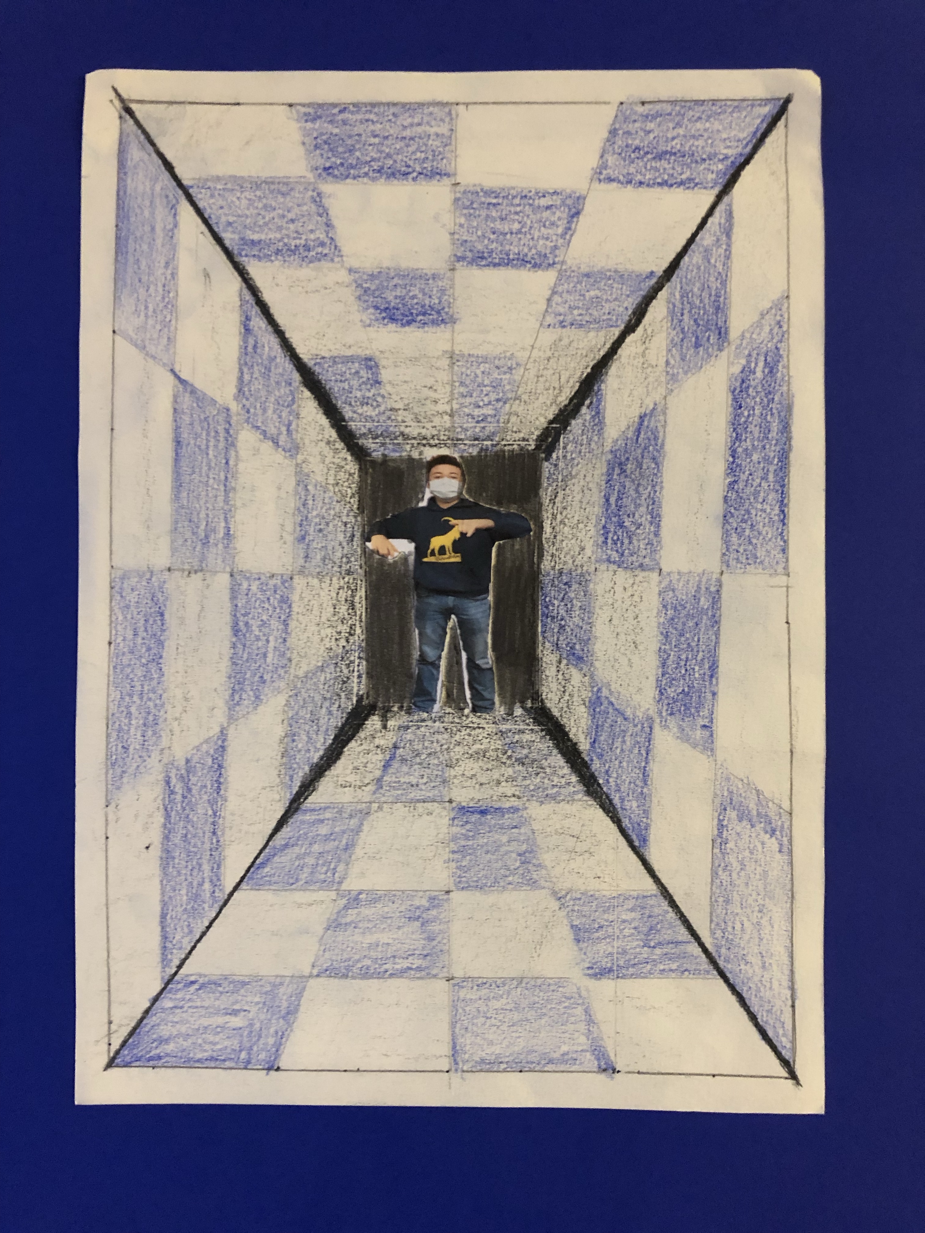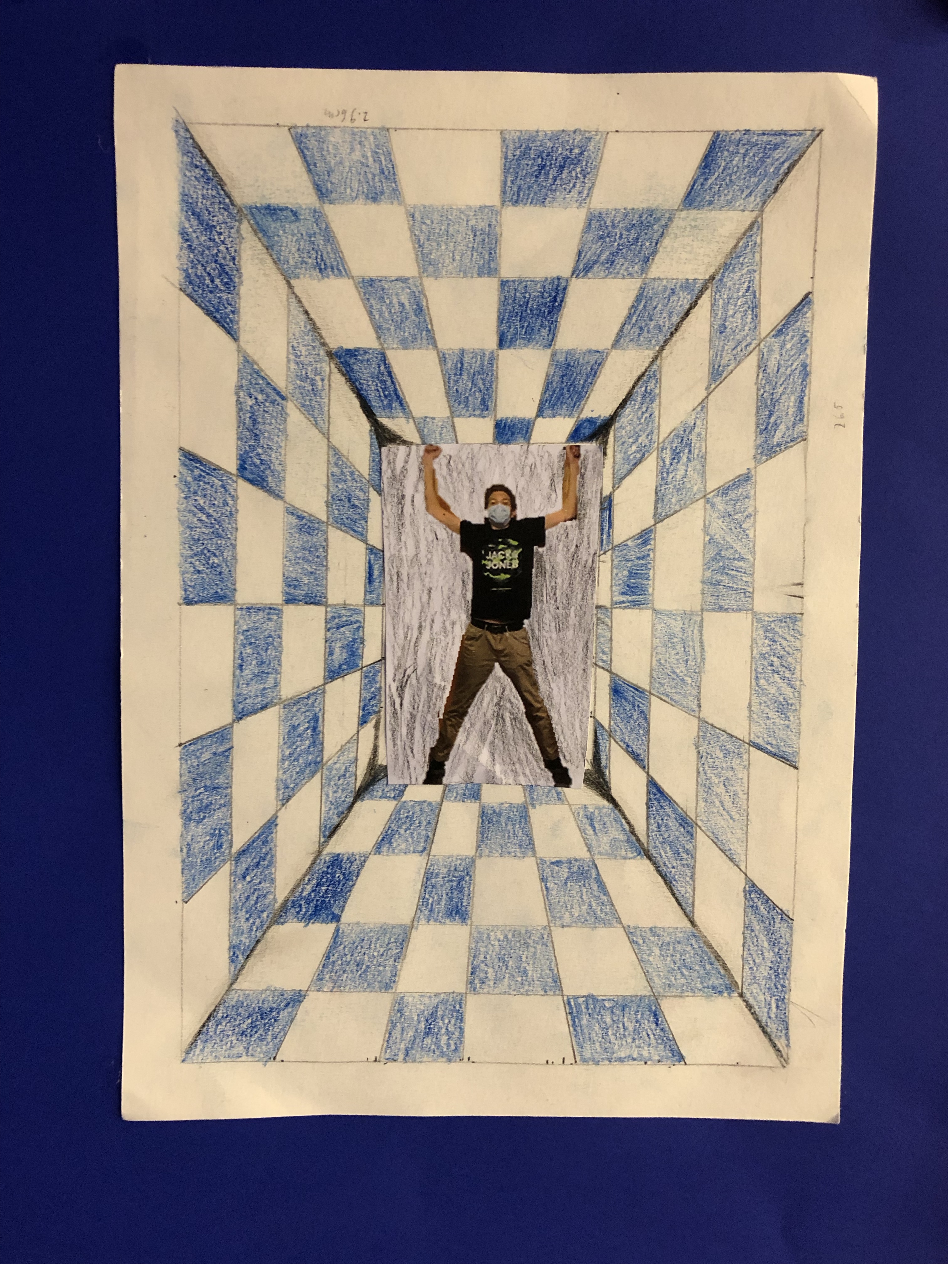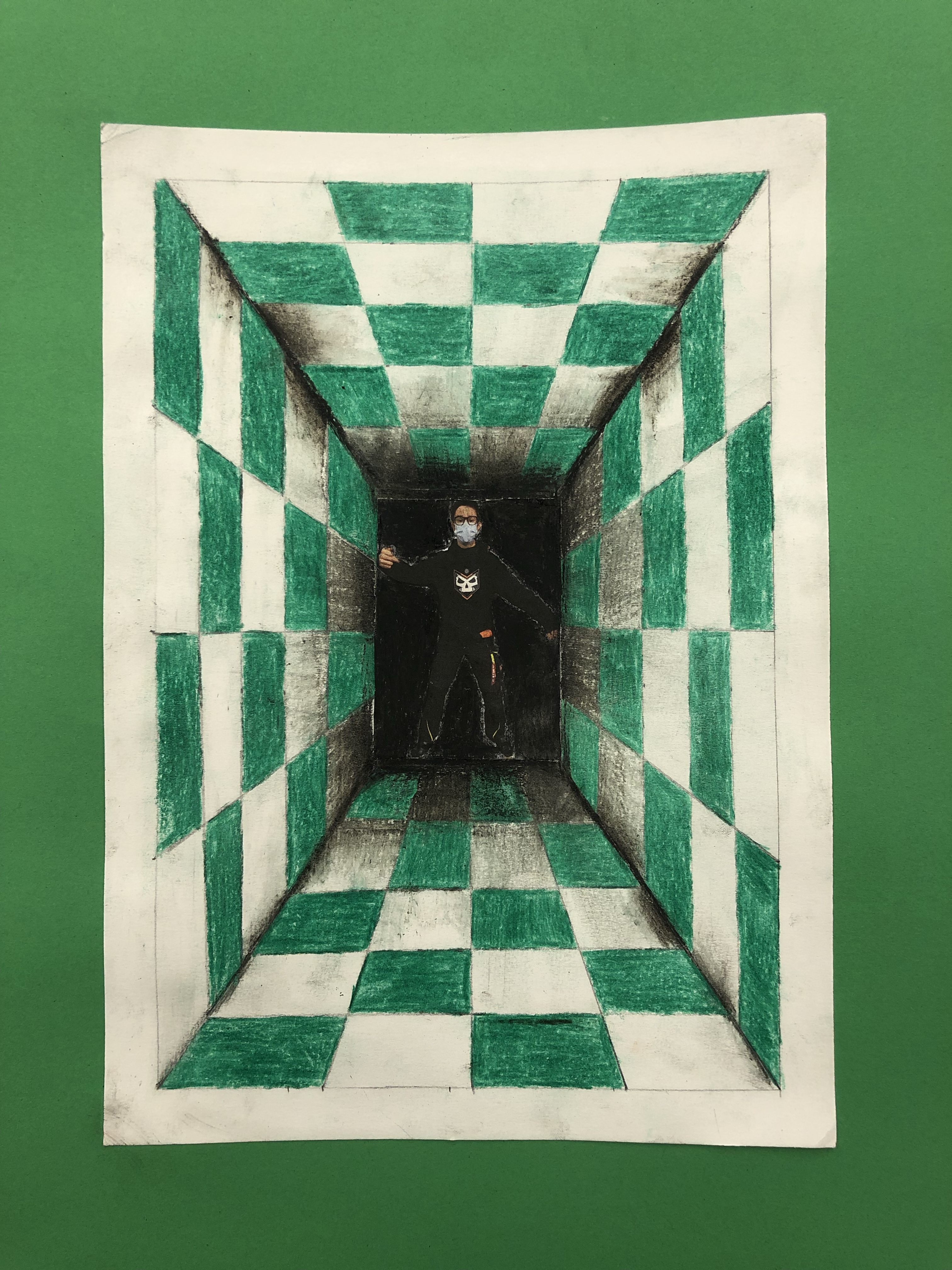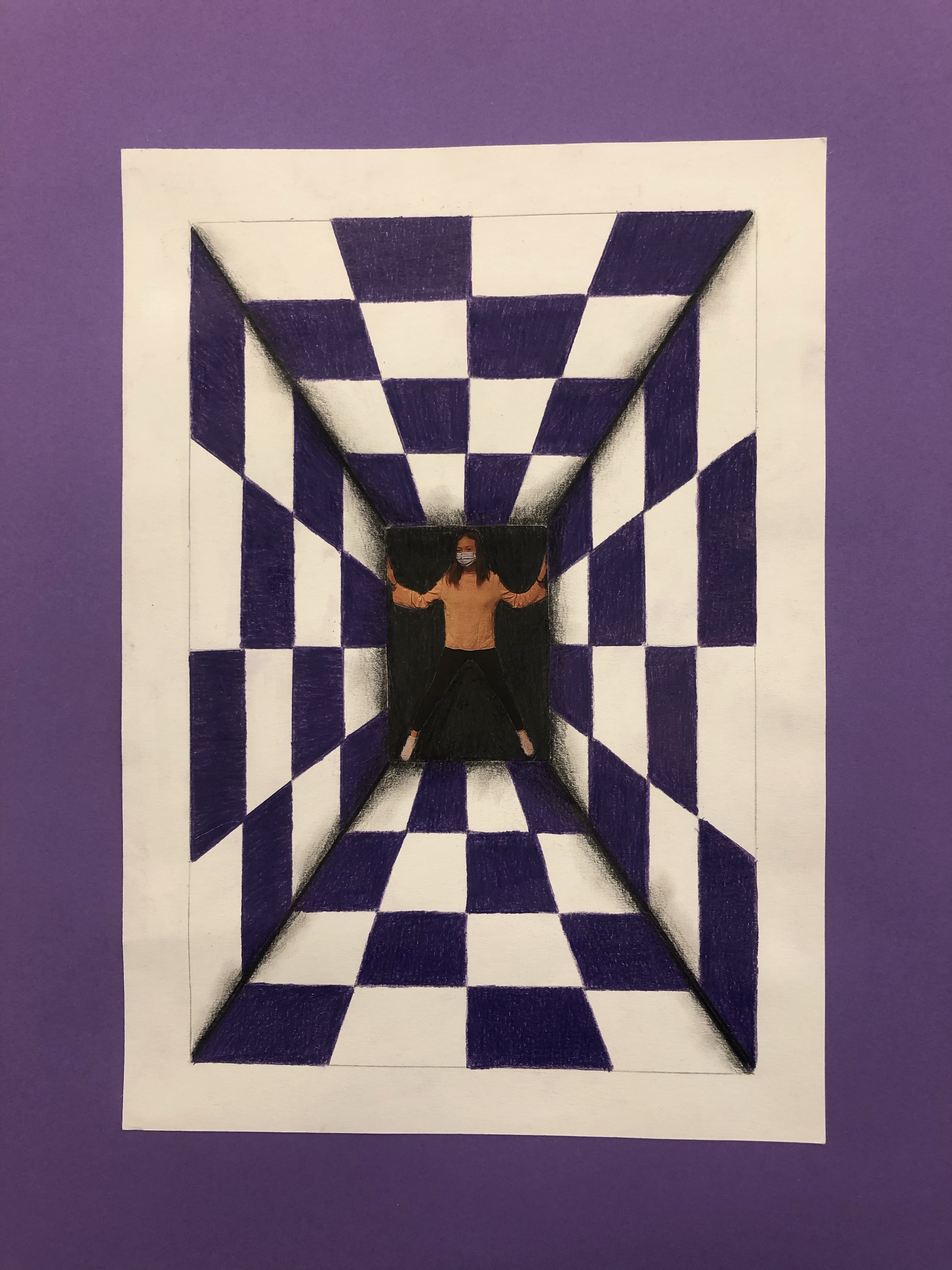 Dieses Foto setzen wir in die Mitte des Raumes, welchen die Schüler mit Karomuster ausmalen. Schattierung hinzufügen und fertig ist das Kunstwerk.