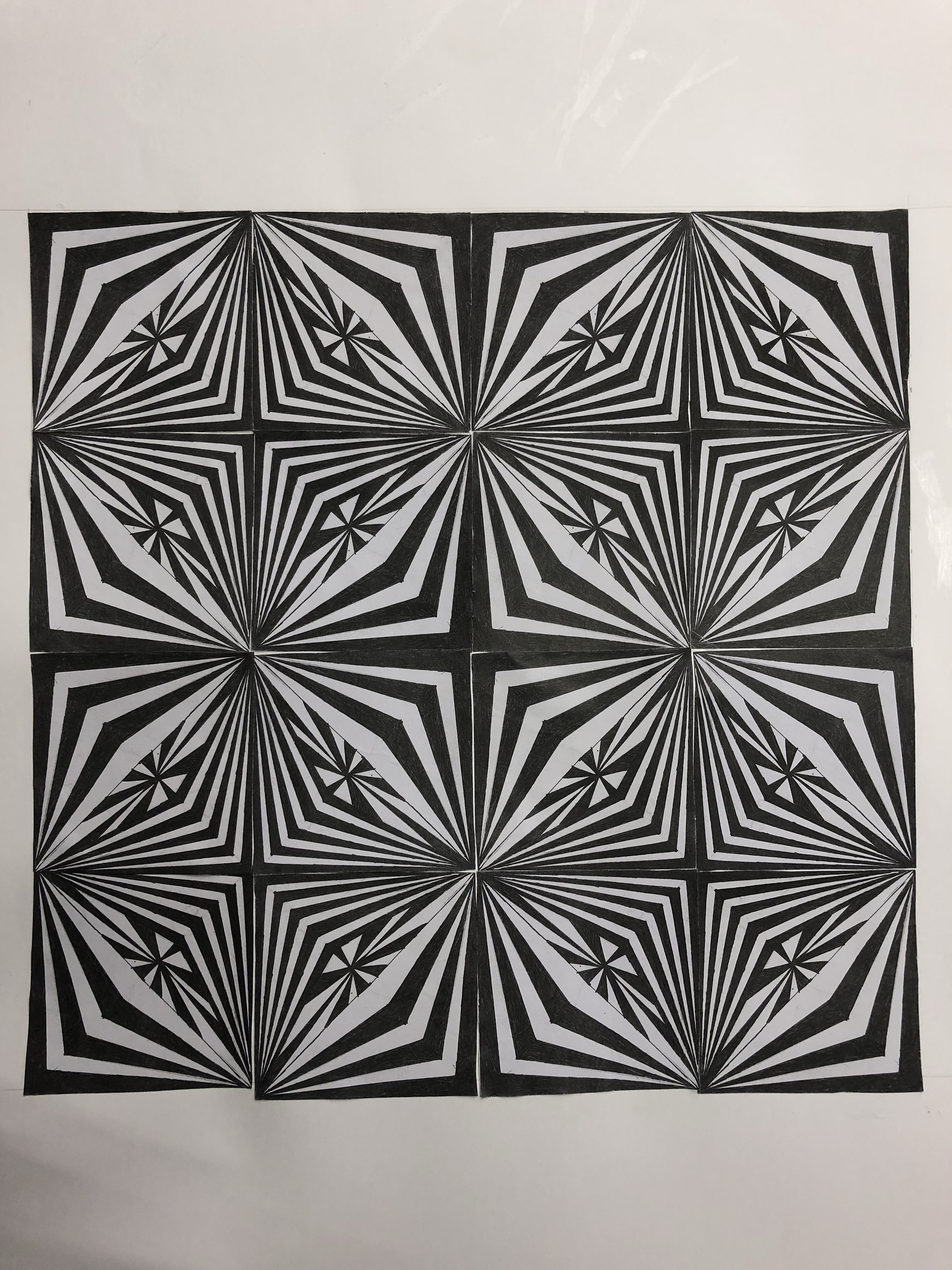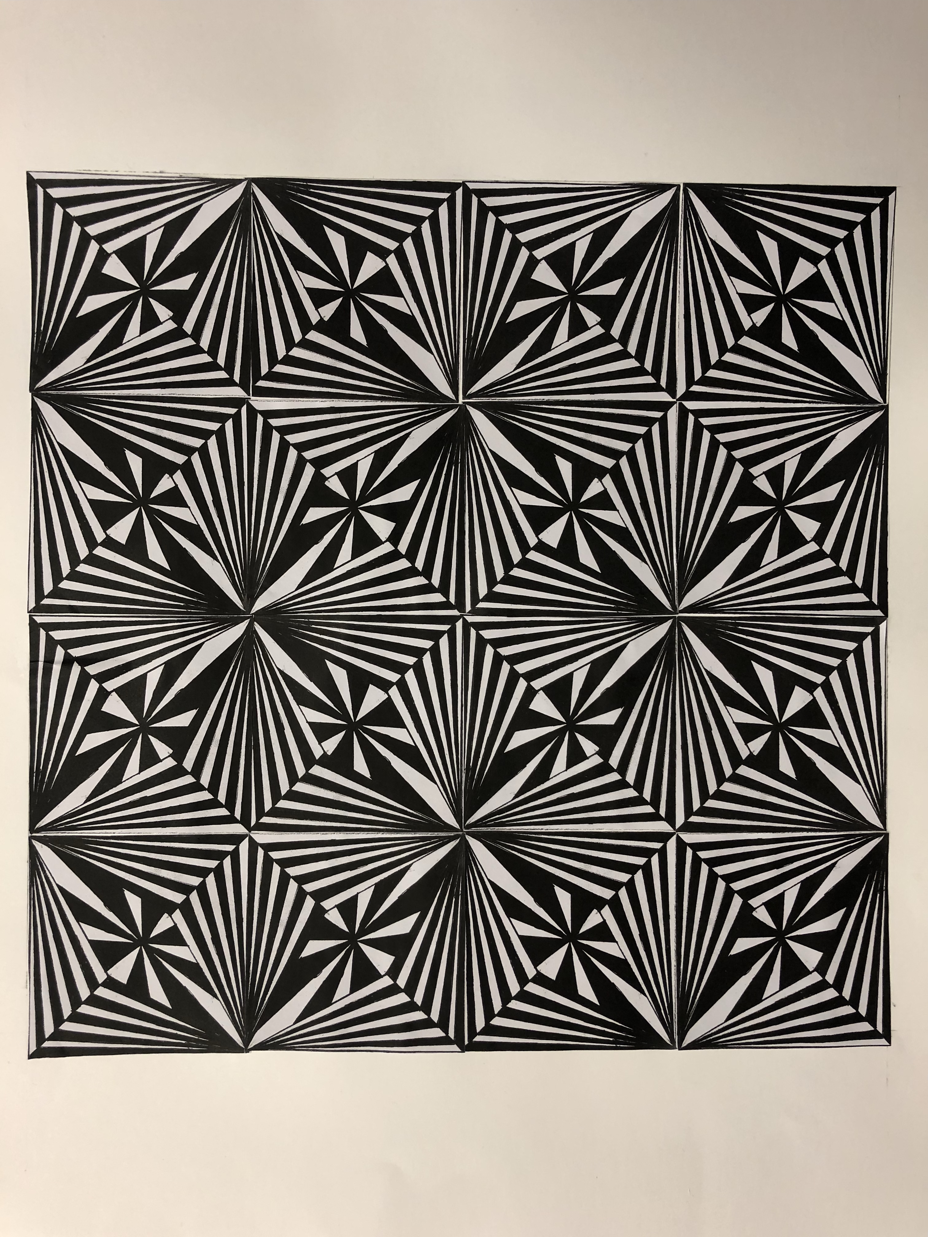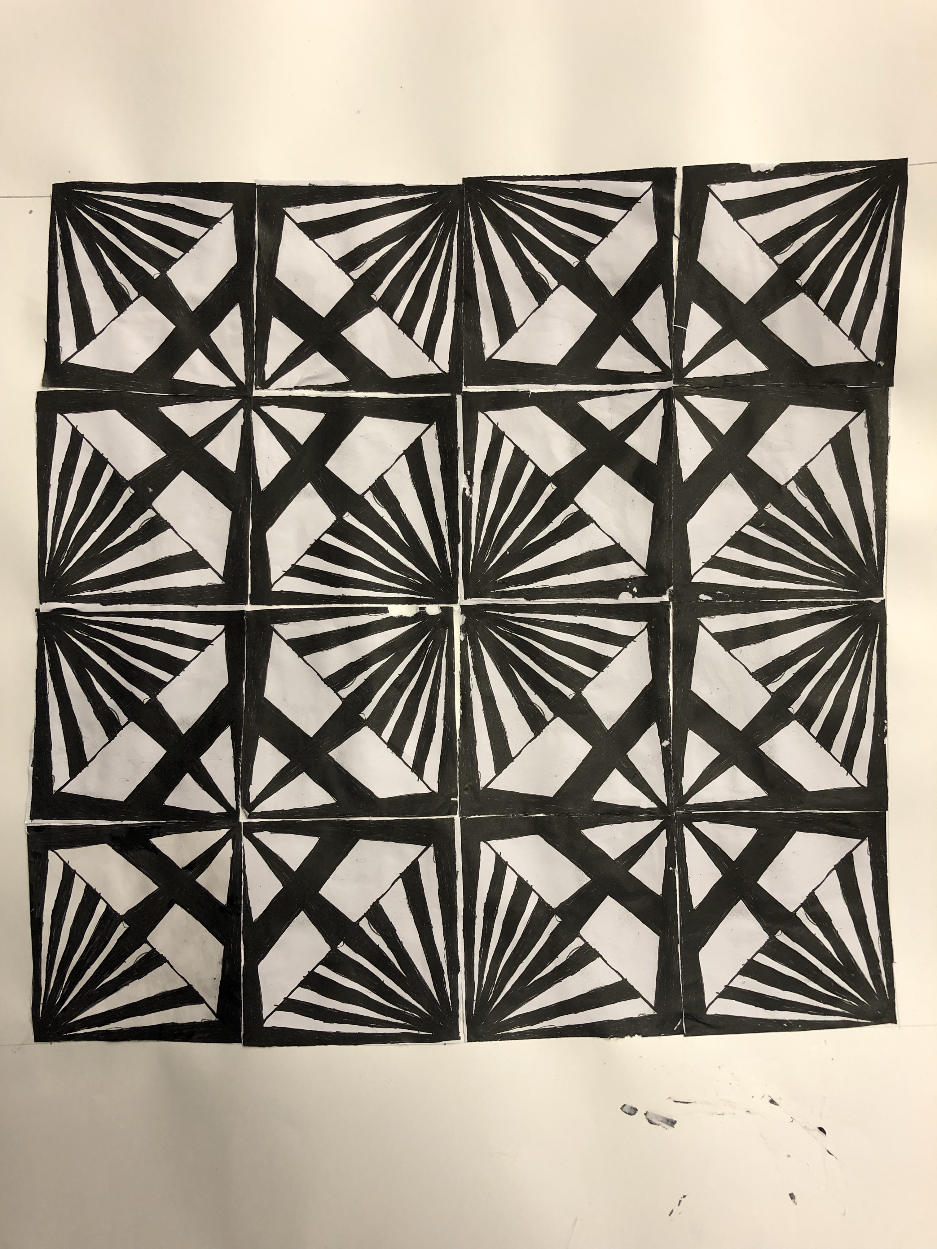 Gestalten eines Quadrates mit Fineliner, welches vervielfältigt wird. Die Quadrate werden hingelegt und nach der grössten optischen Wirkung gesucht. Dann werden die 16 Quadrate aufgeklebt.