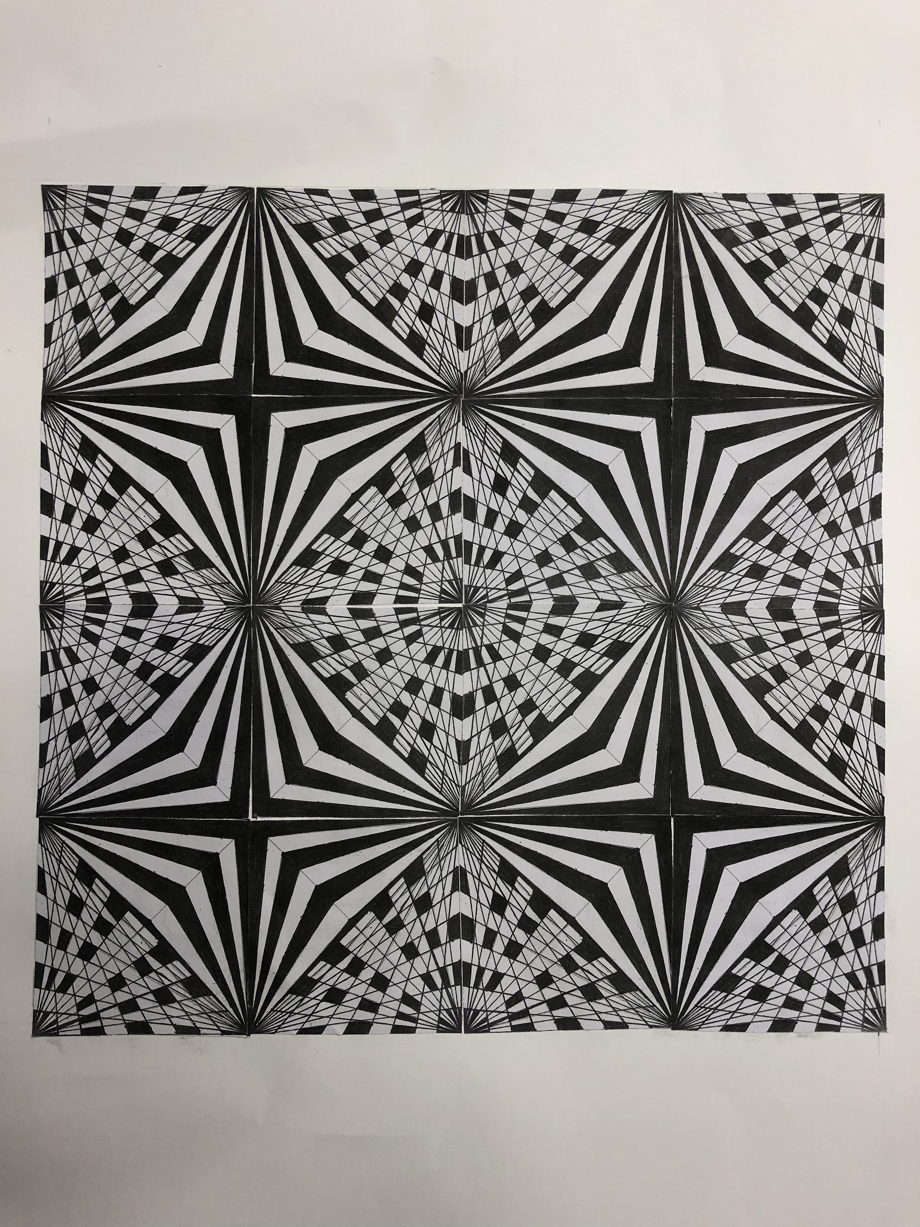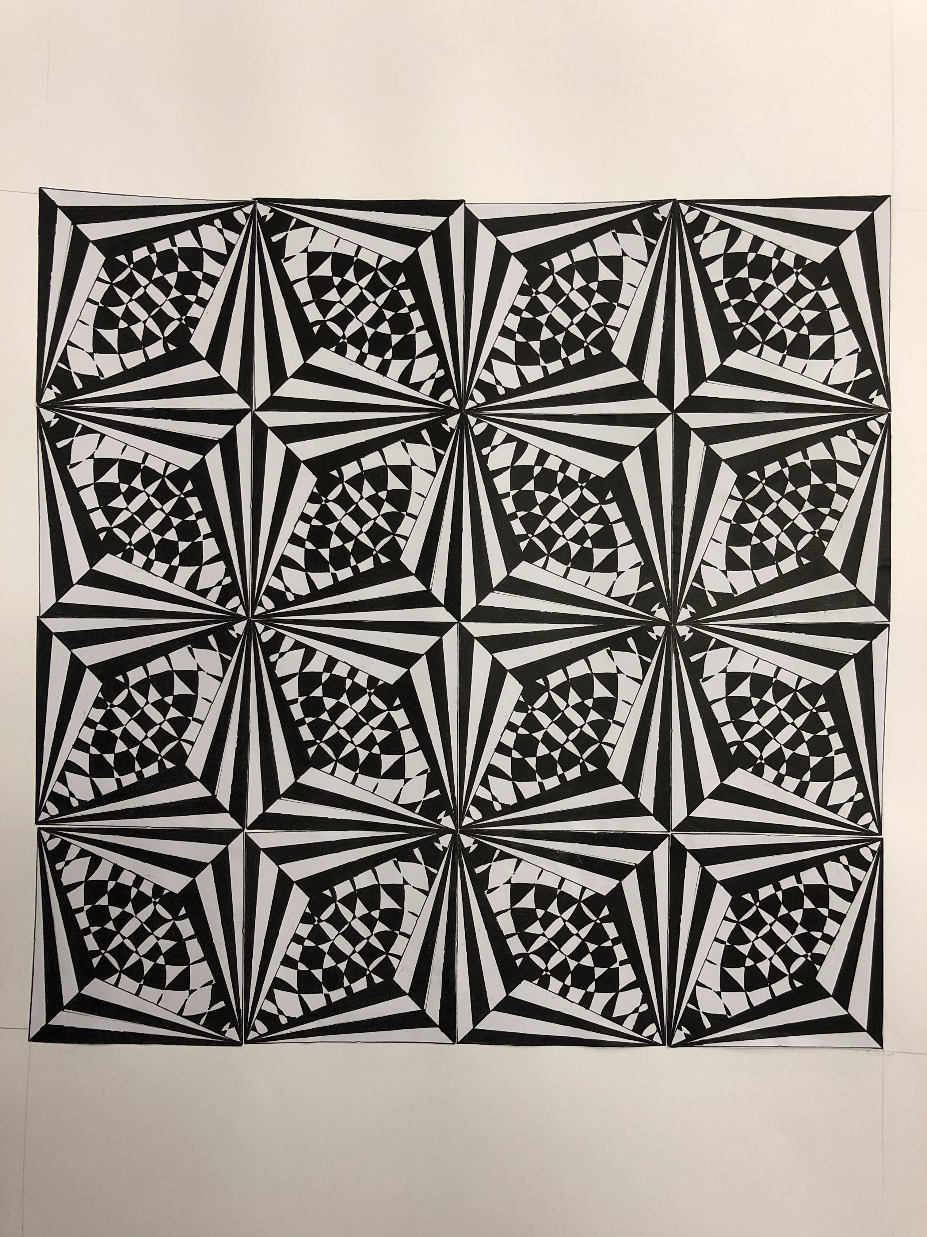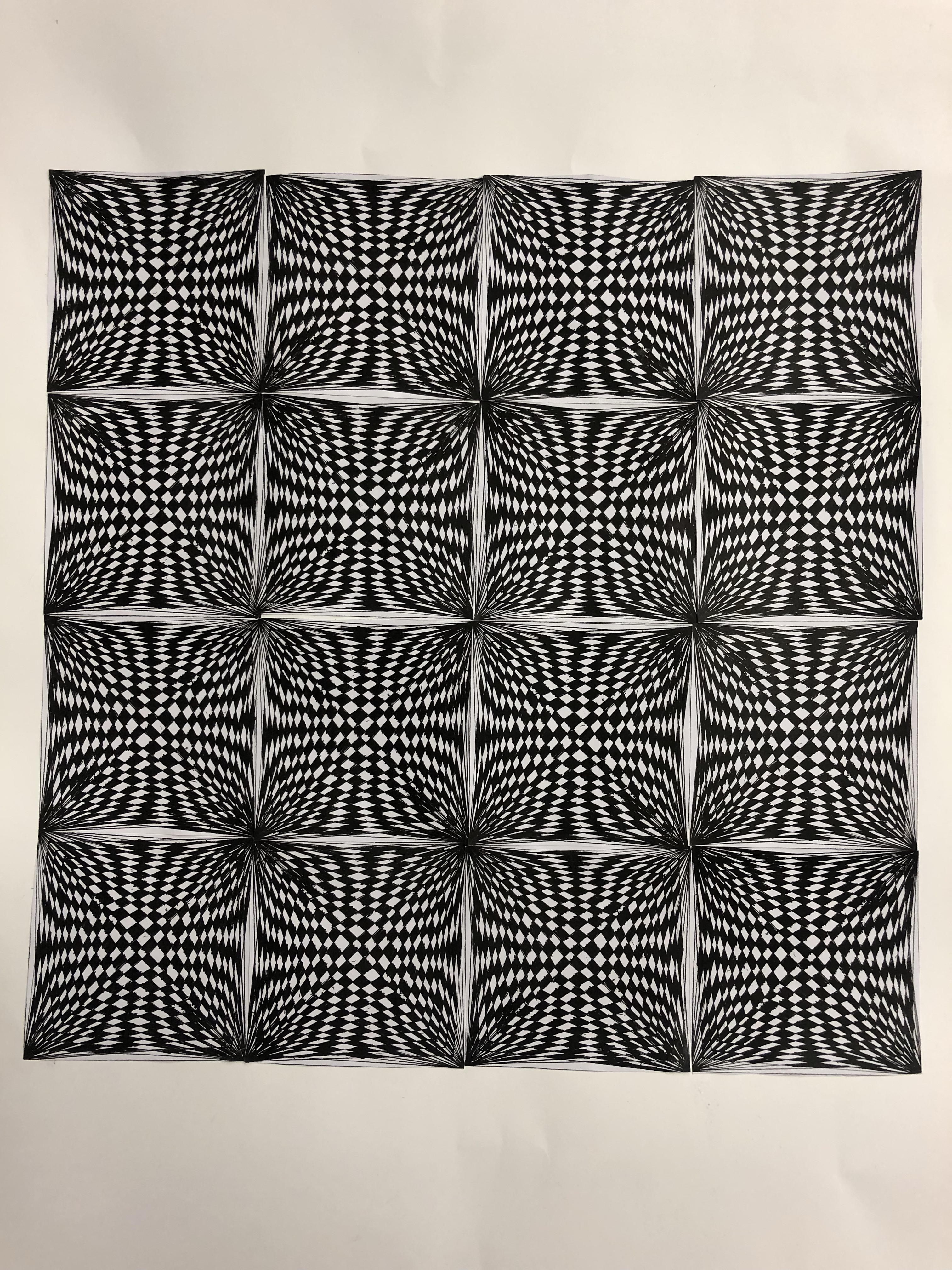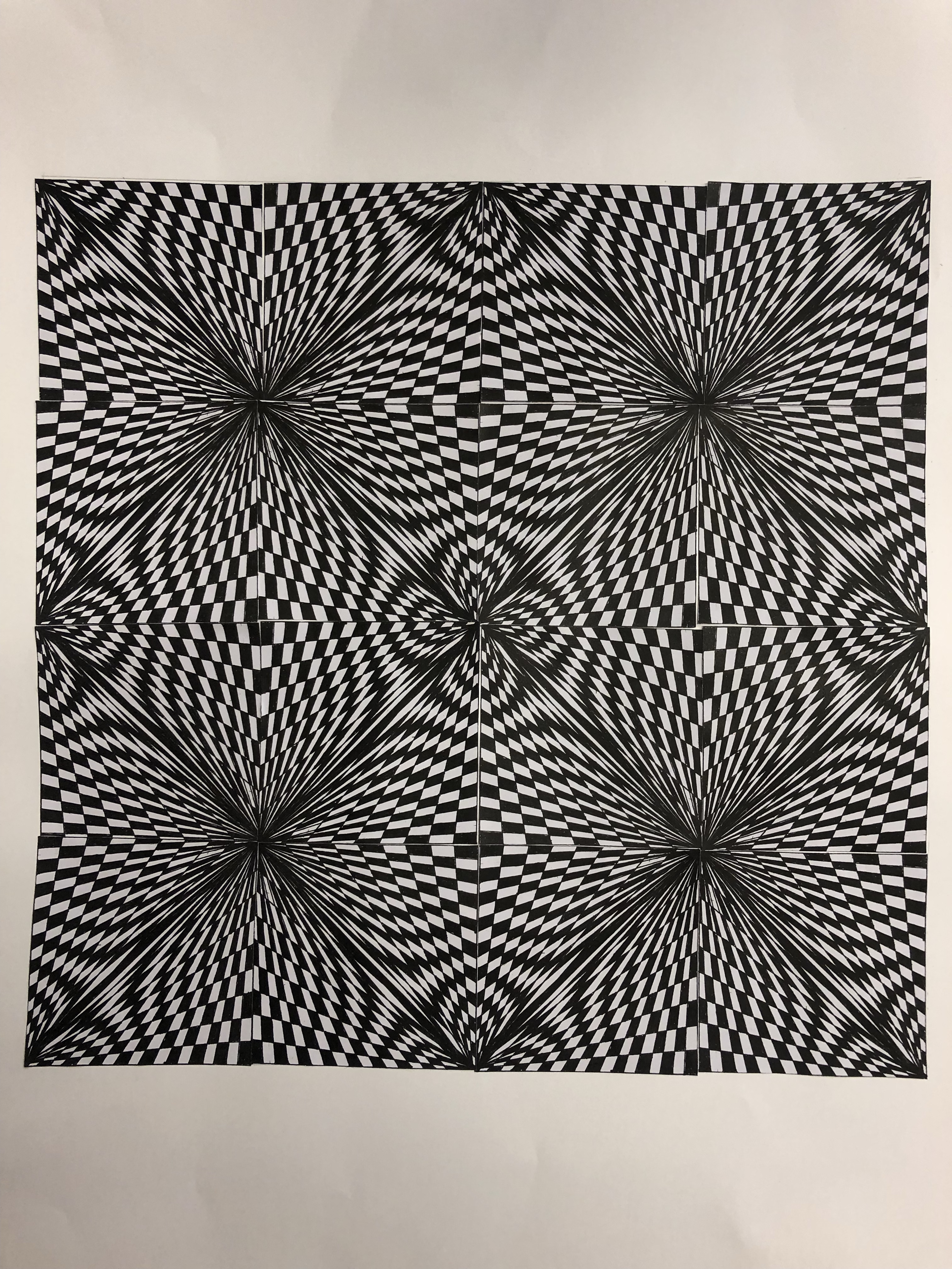 Gestalten eines Quadrates mit Fineliner, welches vervielfältigt wird. Die Quadrate werden hingelegt und nach der grössten optischen Wirkung gesucht. Dann werden die 16 Quadrate aufgeklebt.