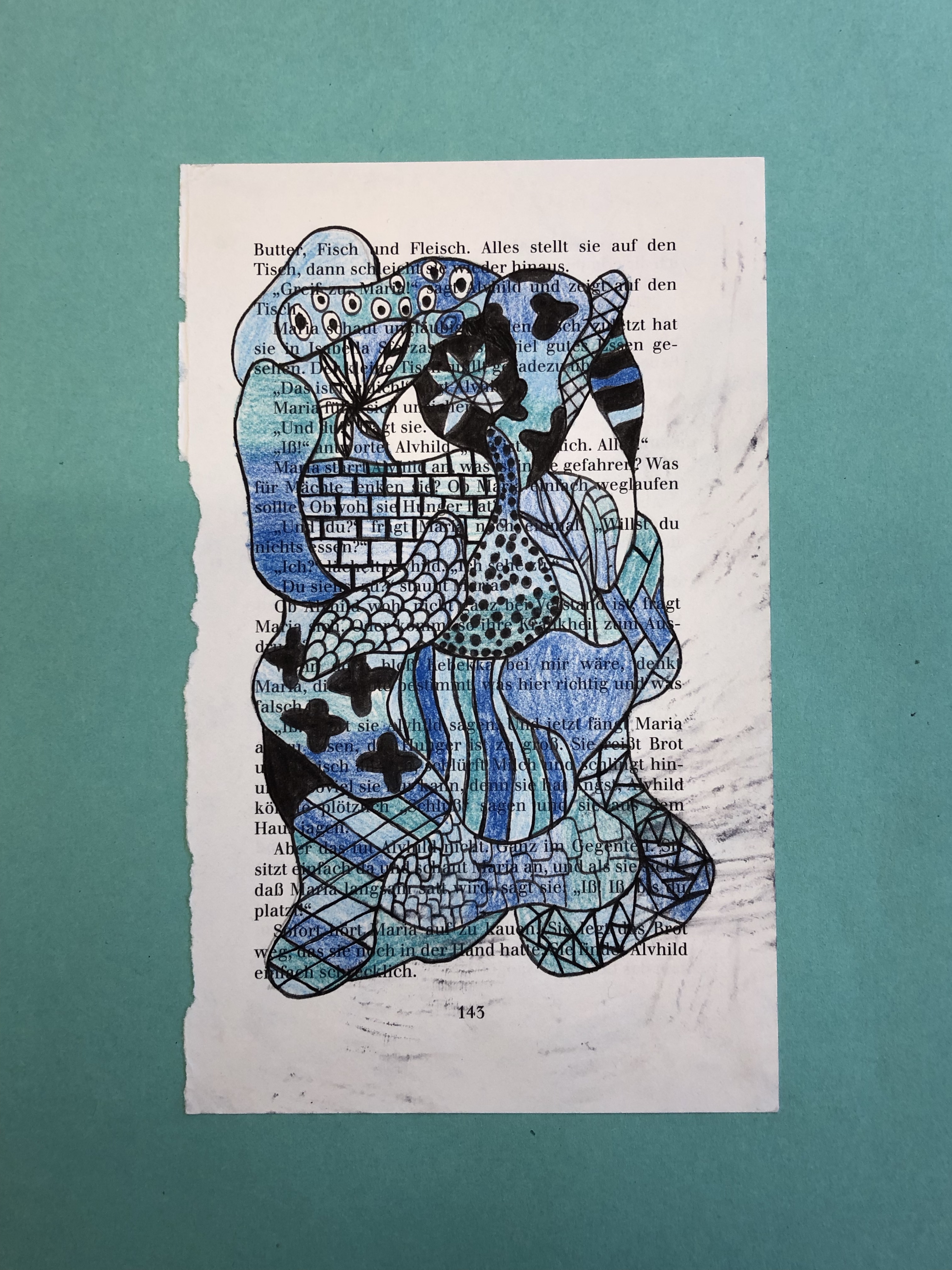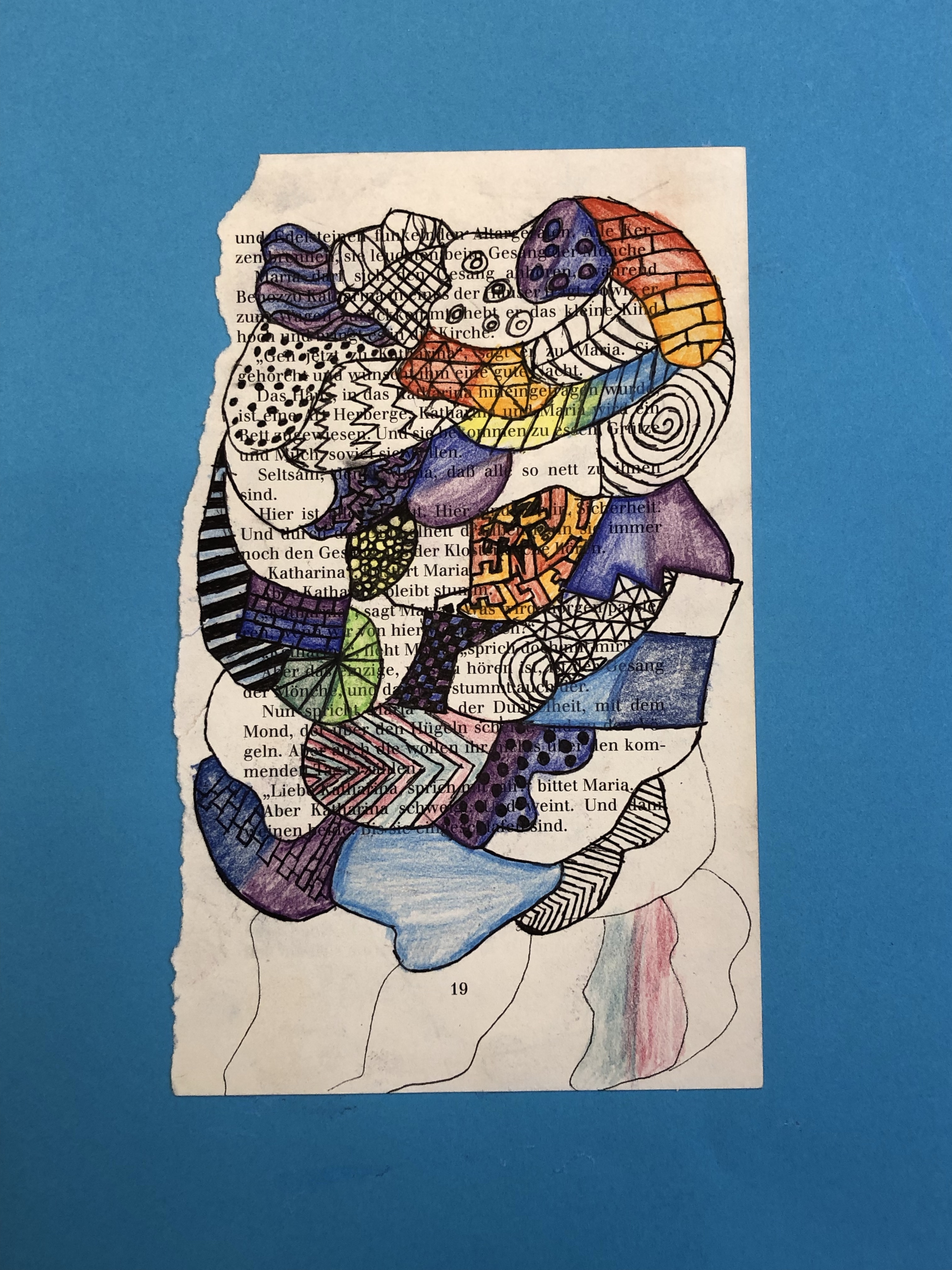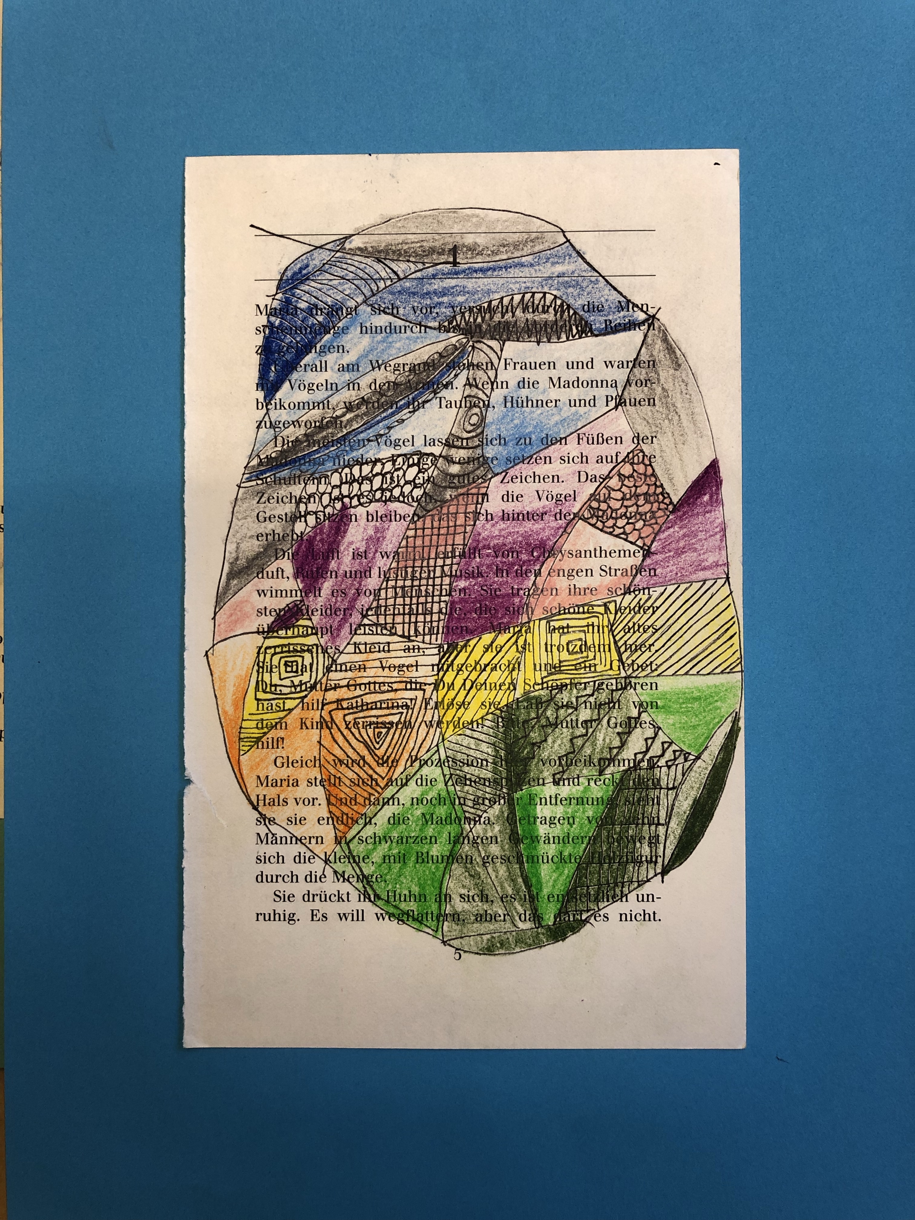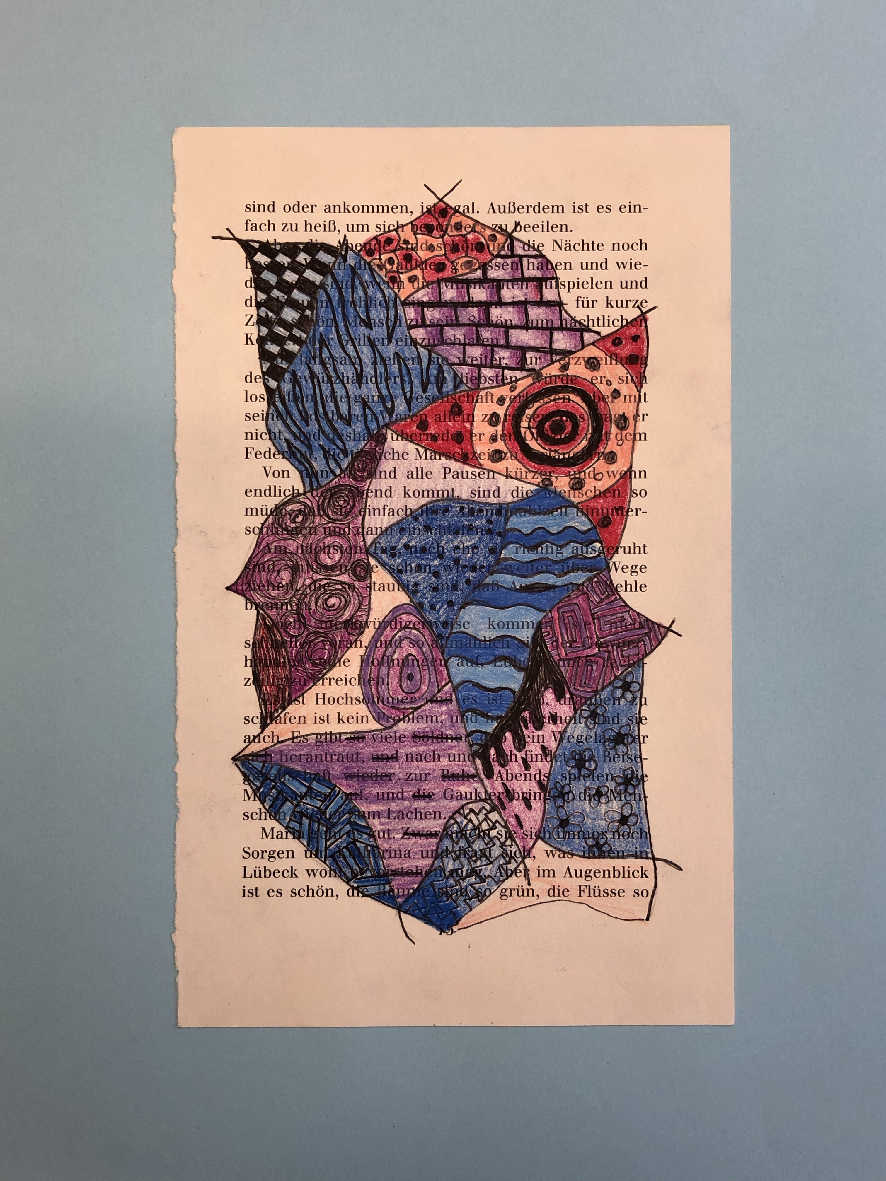 Die SuS zeichnen verschiedene Flächen auf die Buchseite. In die Flächen gestalten sie mit Fineliner verschiedene Muster. Diese werden dann teilweise ausgemalt.