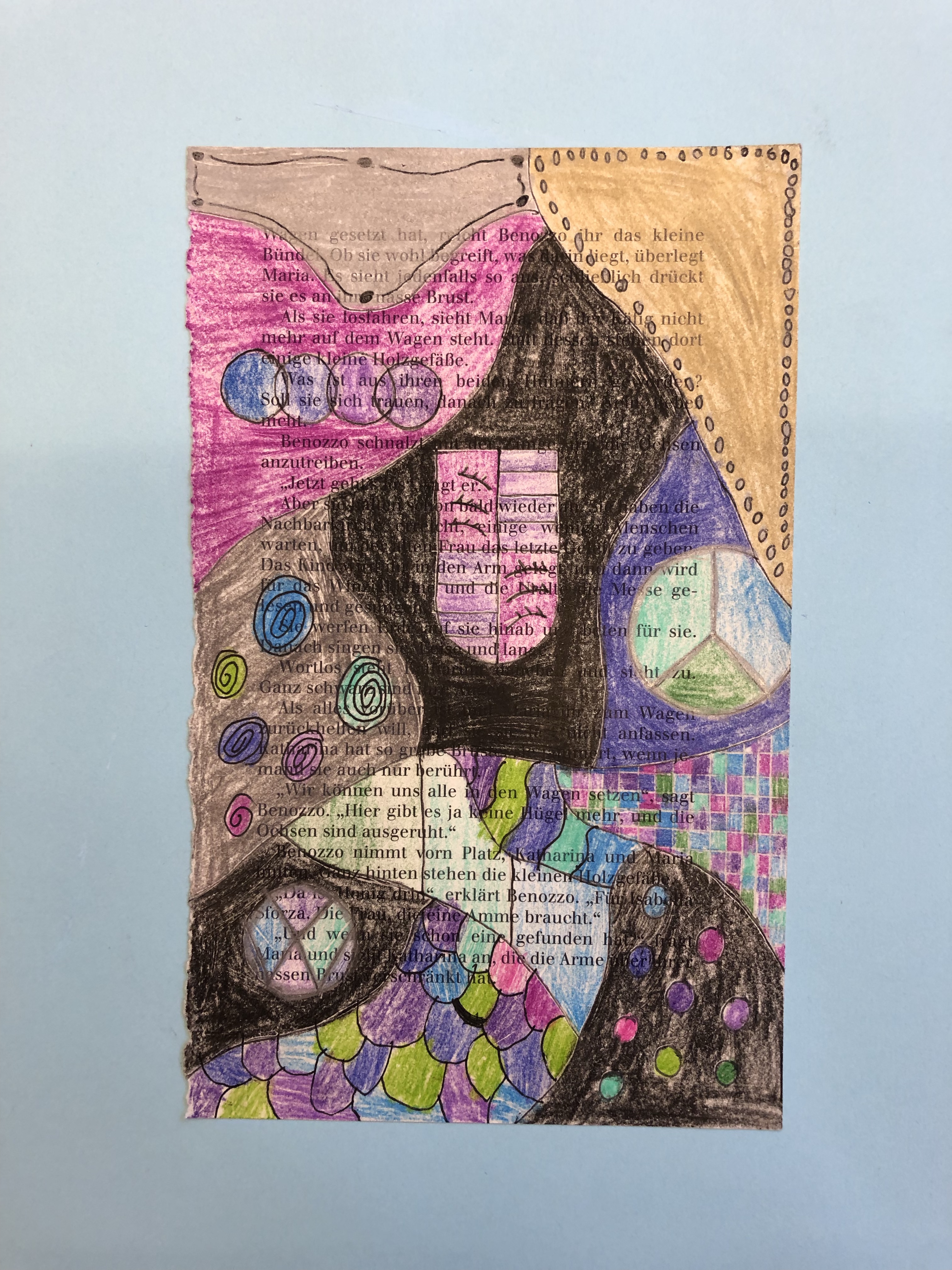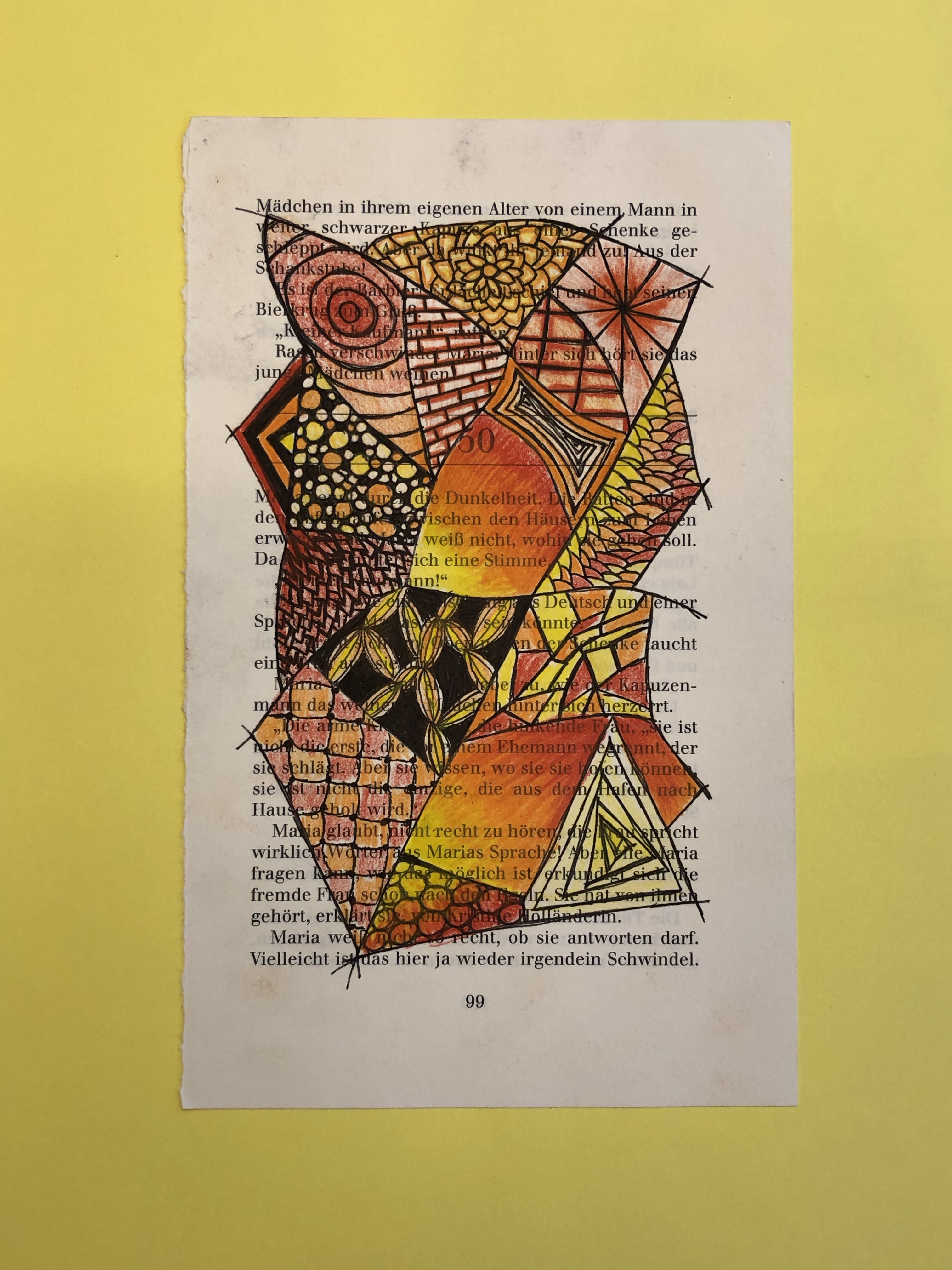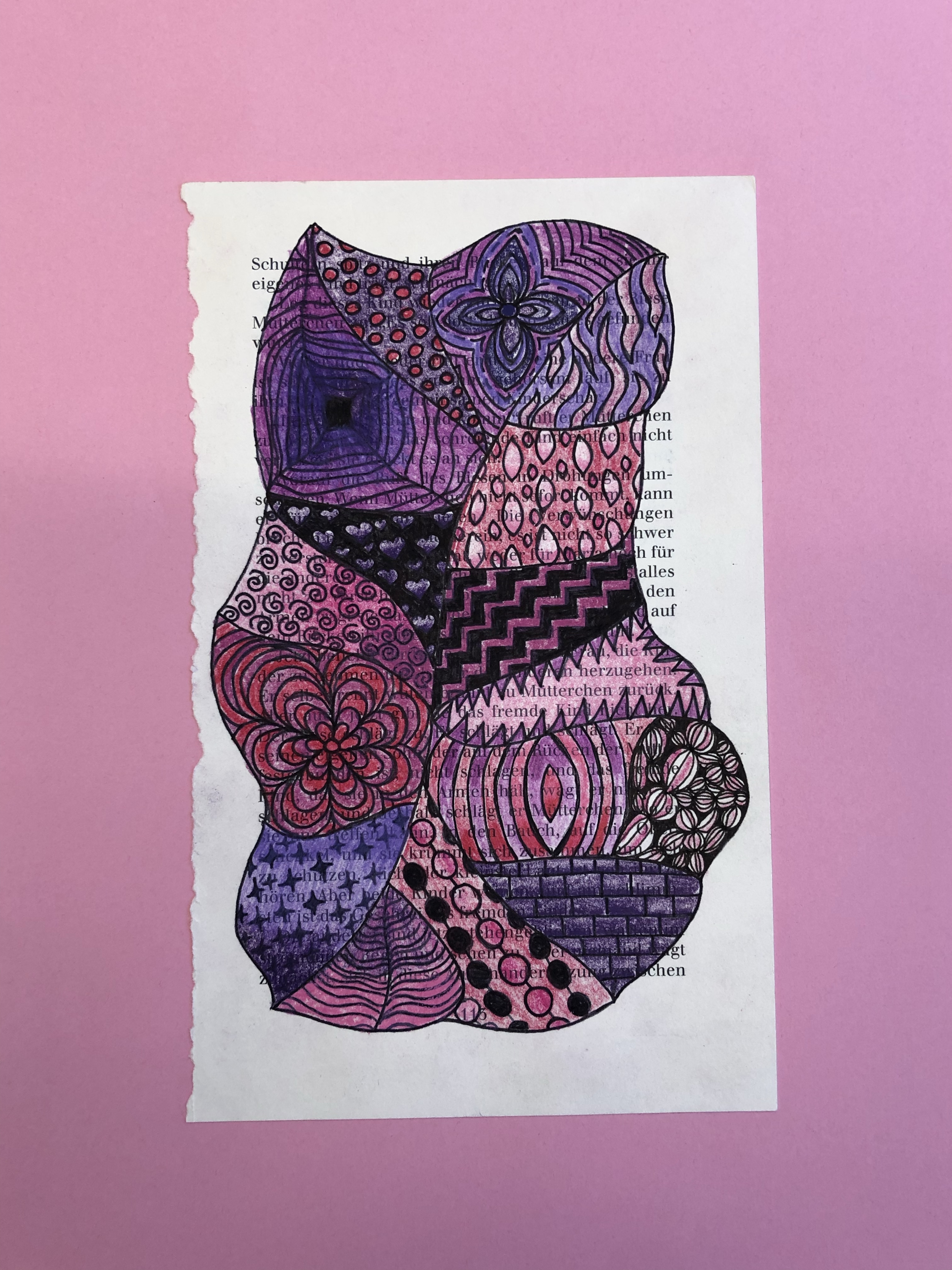 Die SuS zeichnen verschiedene Flächen auf die Buchseite. In die Flächen gestalten sie mit Fineliner verschiedene Muster. Diese werden dann teilweise ausgemalt.