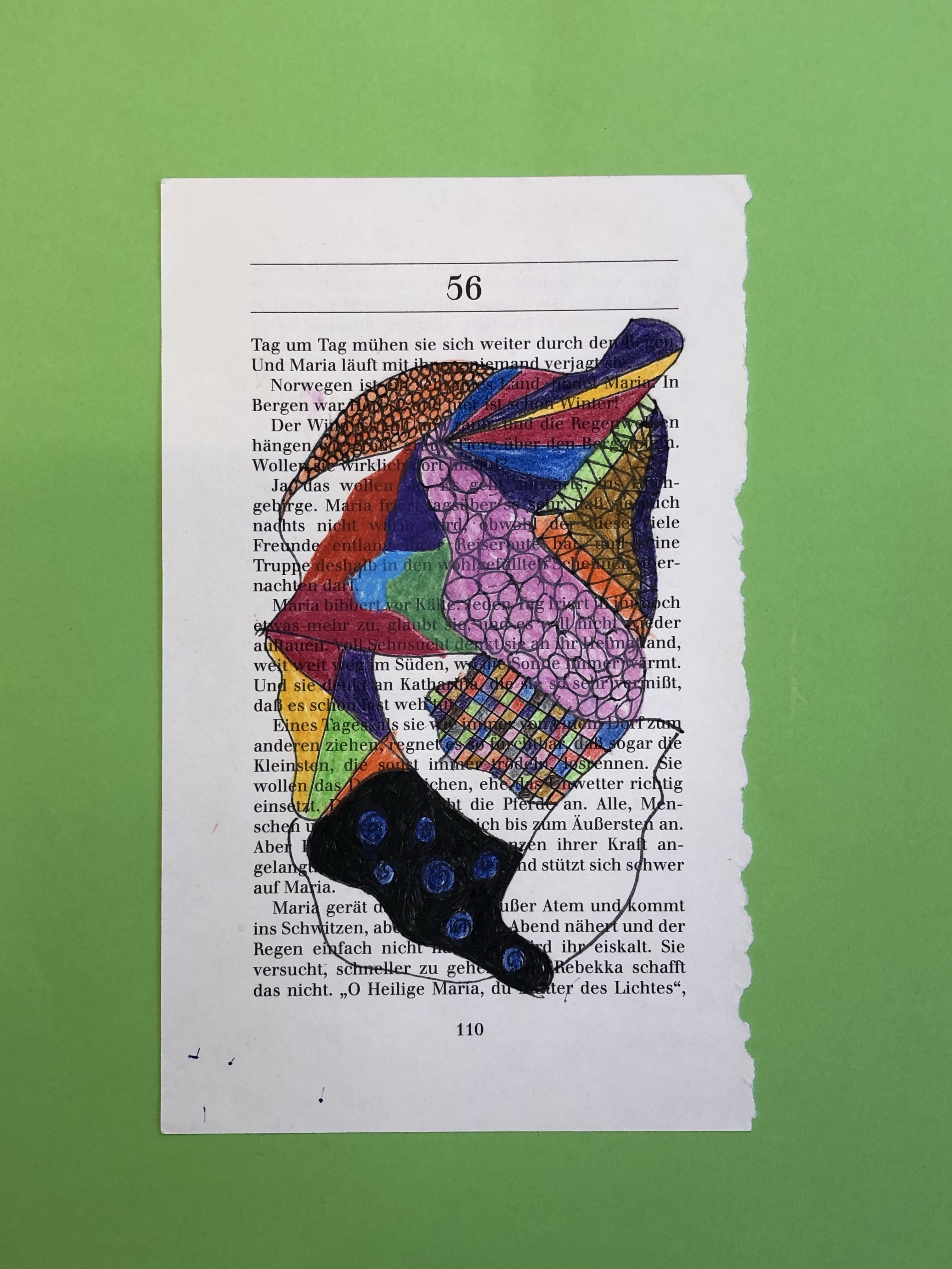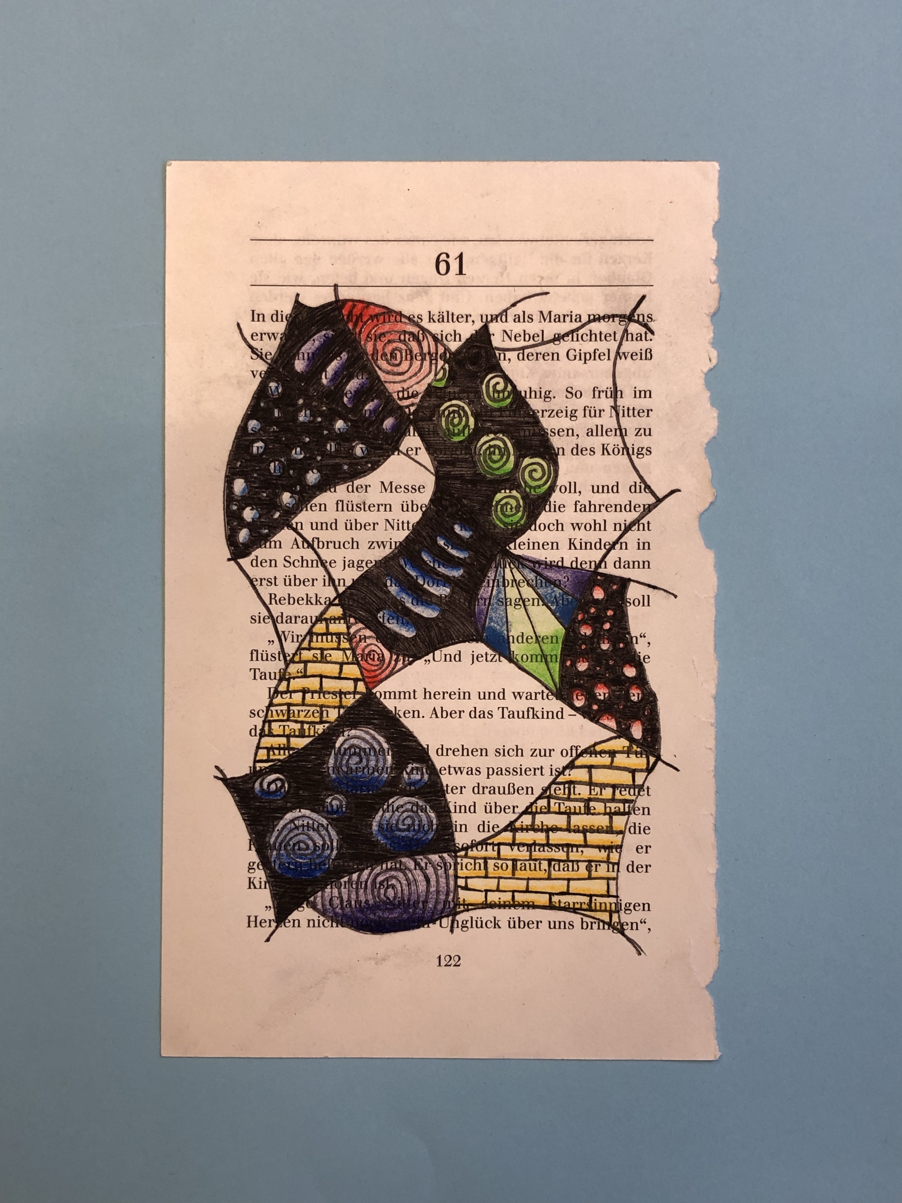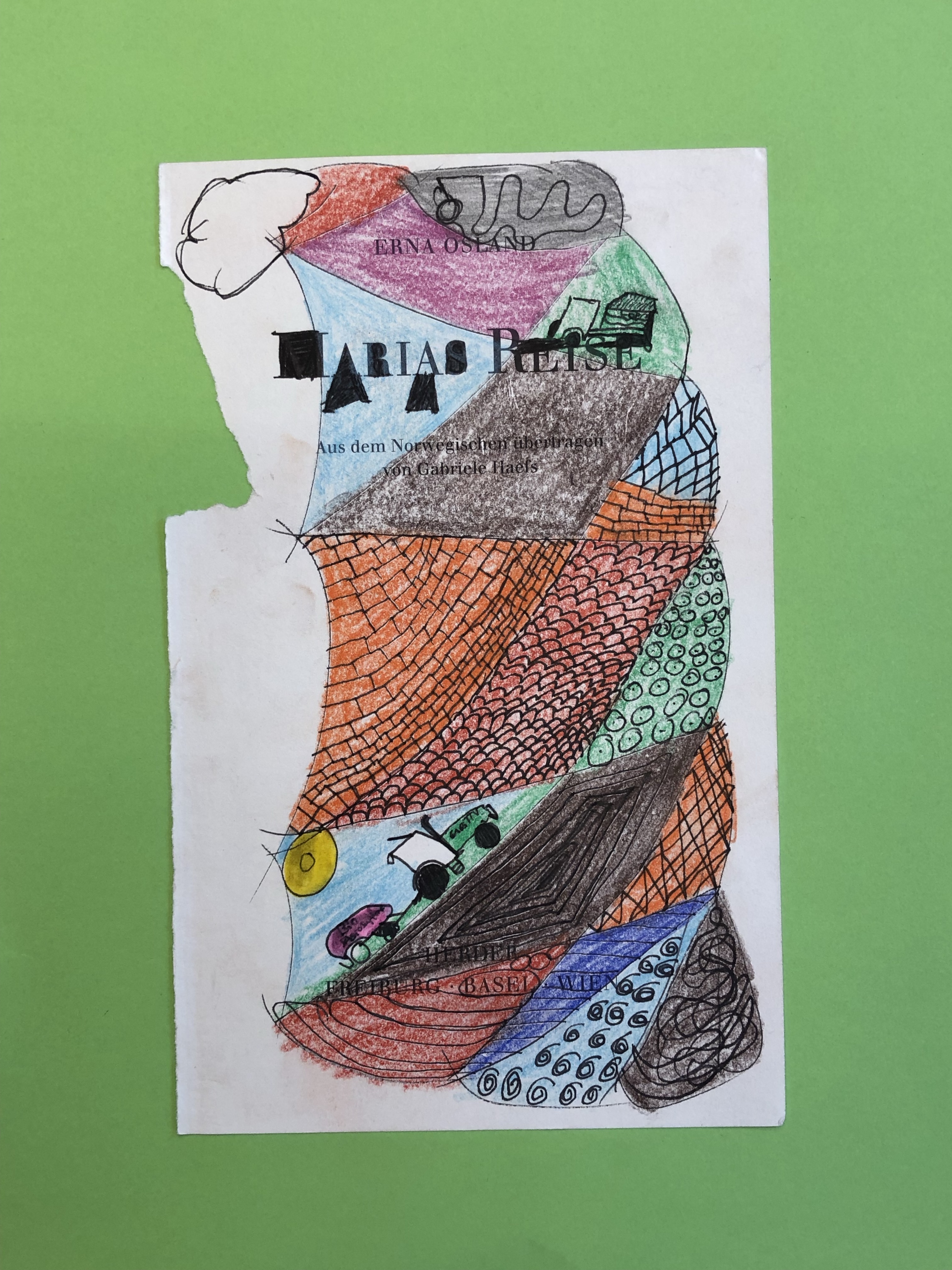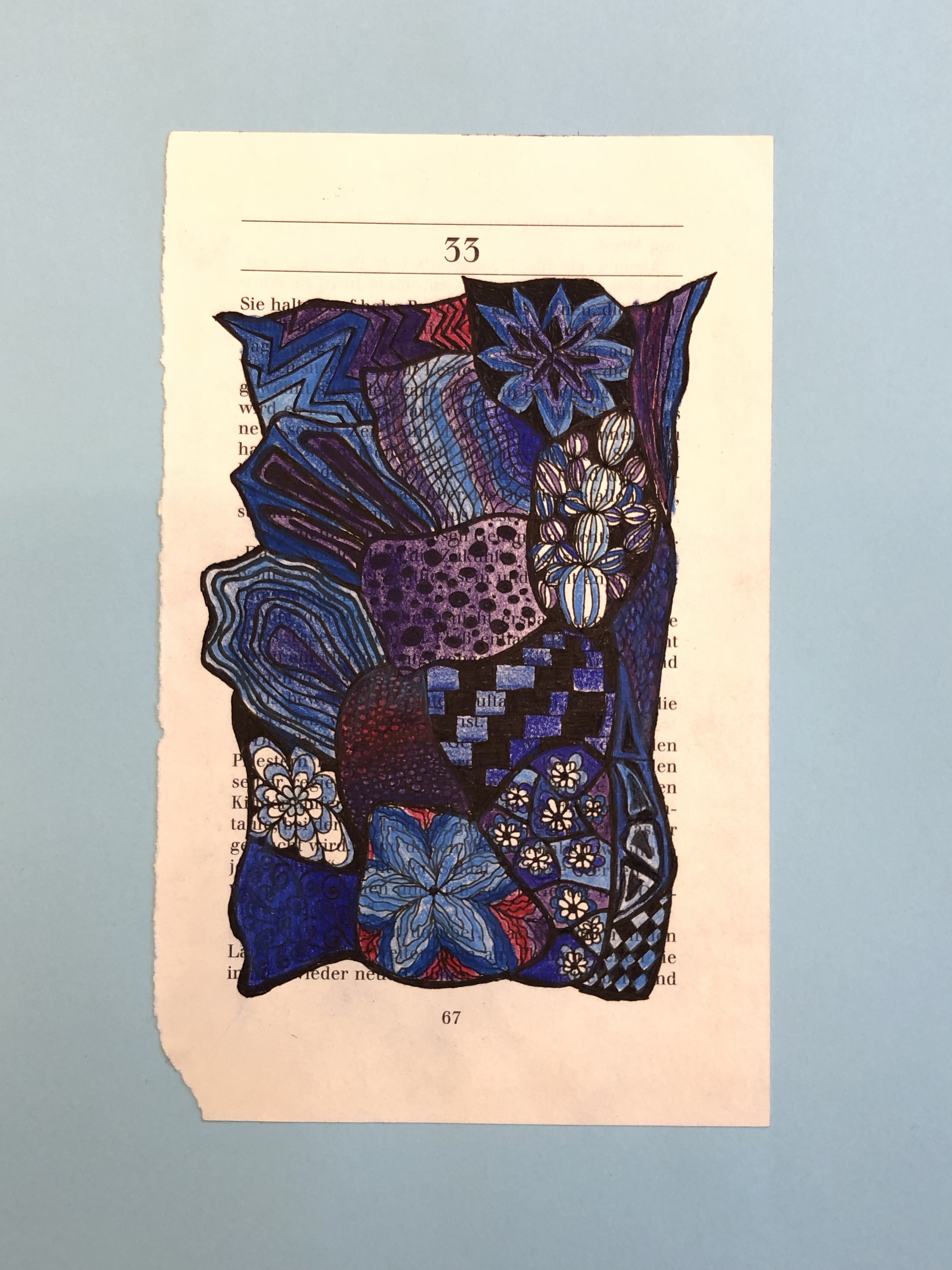 Die SuS zeichnen verschiedene Flächen auf die Buchseite. In die Flächen gestalten sie mit Fineliner verschiedene Muster. Diese werden dann teilweise ausgemalt.