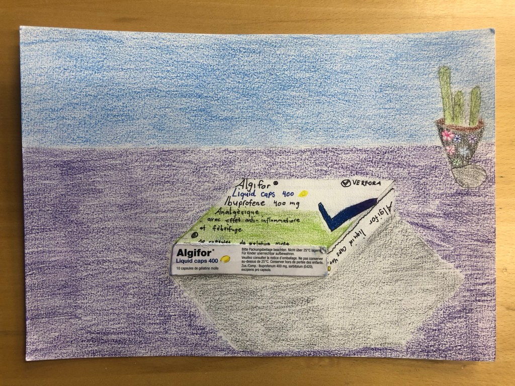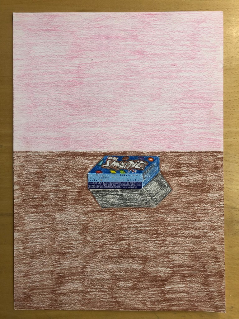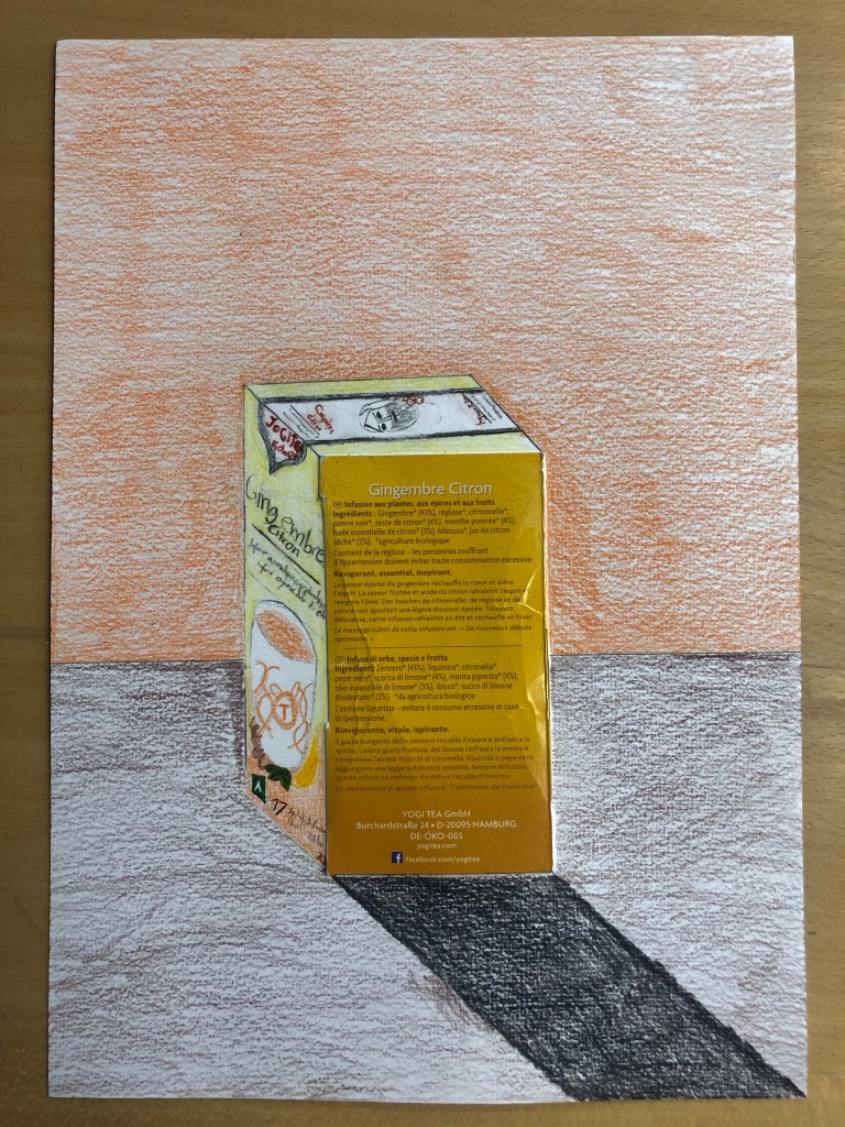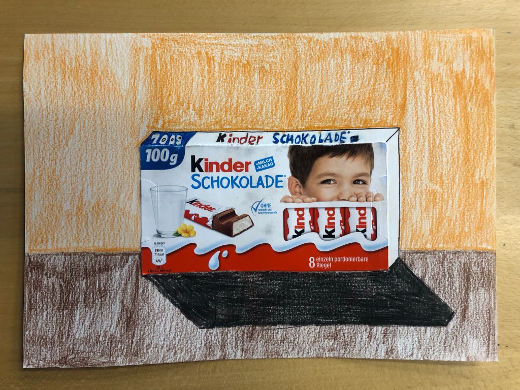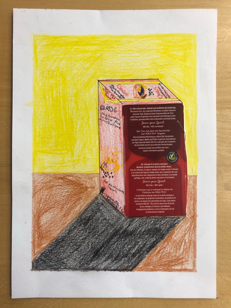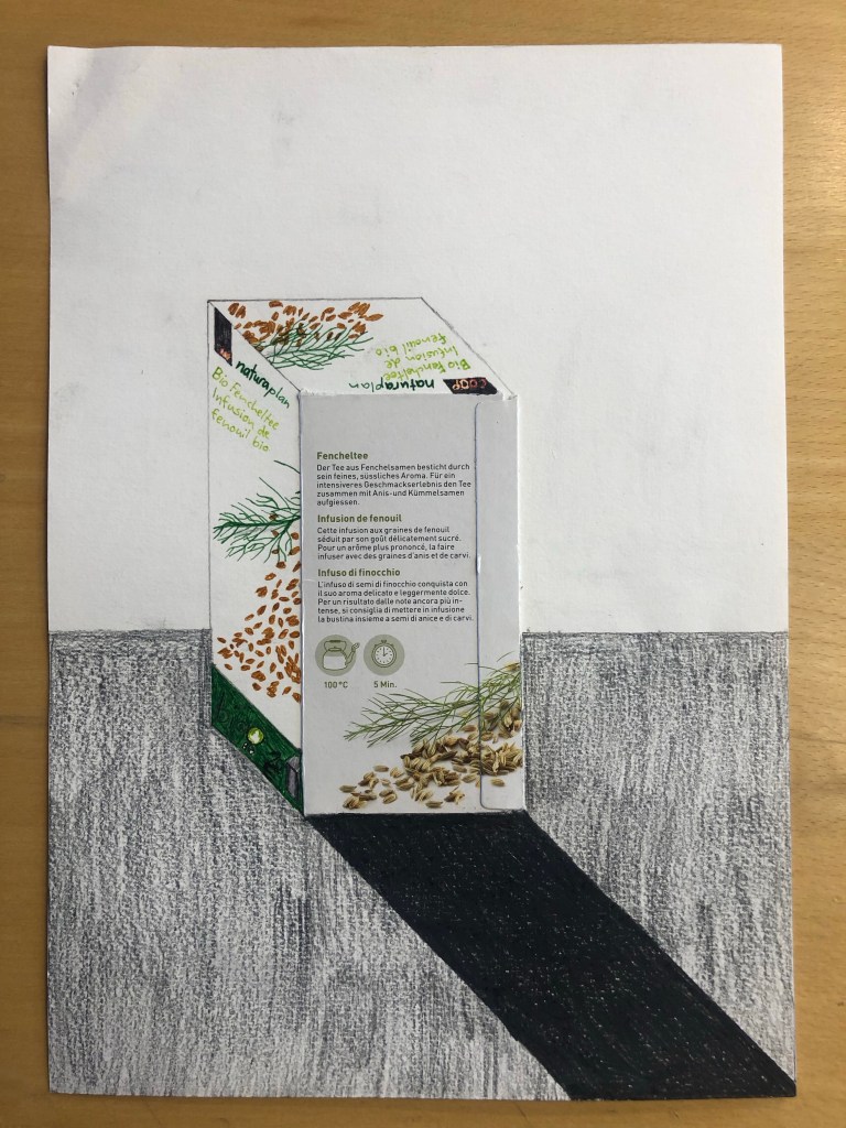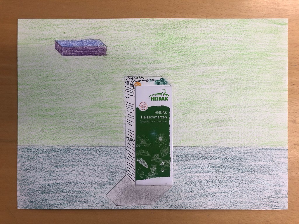Eine Seite einer Schachtel wird ausgeschnitten, aufgeklebt und die andern sichtbaren Seiten mit Farbstiften in Parallelperspektive ergänzt.